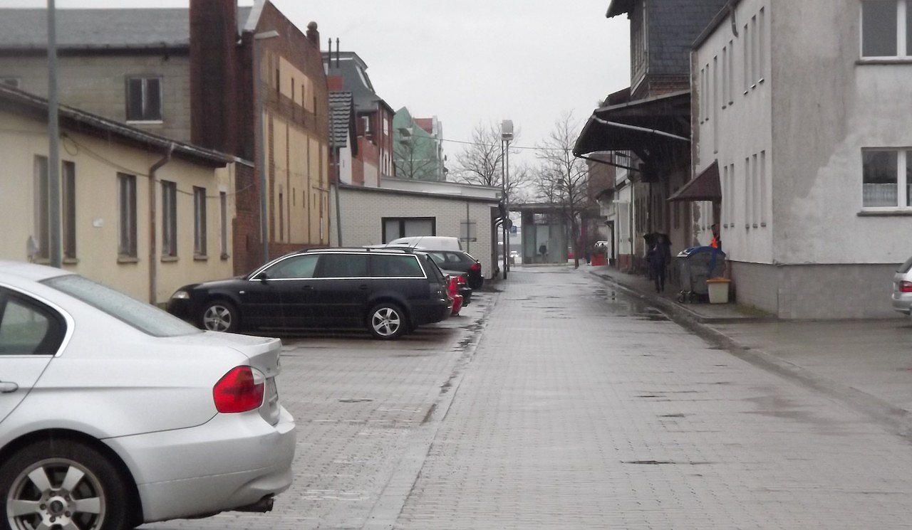 Der Blick Richtung Bahnhofsplatz am gleichen Tag, dort, wo die beiden Gebäude rechts stehen, befanden sich Empfangsgebäude und Toilettenhäuschen der NWE von 1897 bis 1913 (Foto: W.Schwarzbach)