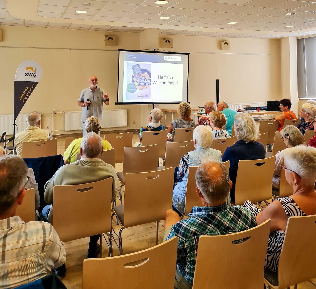 Die Städtische Wohnungsbaugesellschaft (SWG) hat in Kooperation mit der Polizei ihre erste gemeinsame Informationsveranstaltung im Begegnungszentrum Nordhaus angeboten. Unter dem Titel Enkeltrick und Schockanrufe - nicht mit uns referierte Kriminalhauptkommissar Steffen Ritschel über aktuelle Betrugsmaschen. Eine Fortsetzung ist schon in Planung...