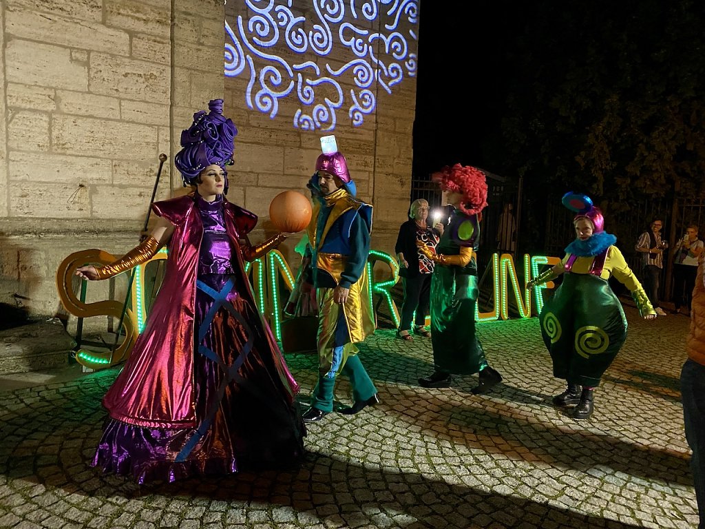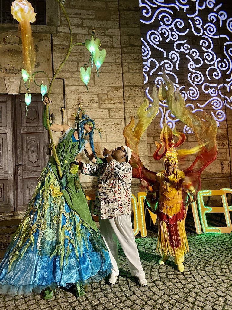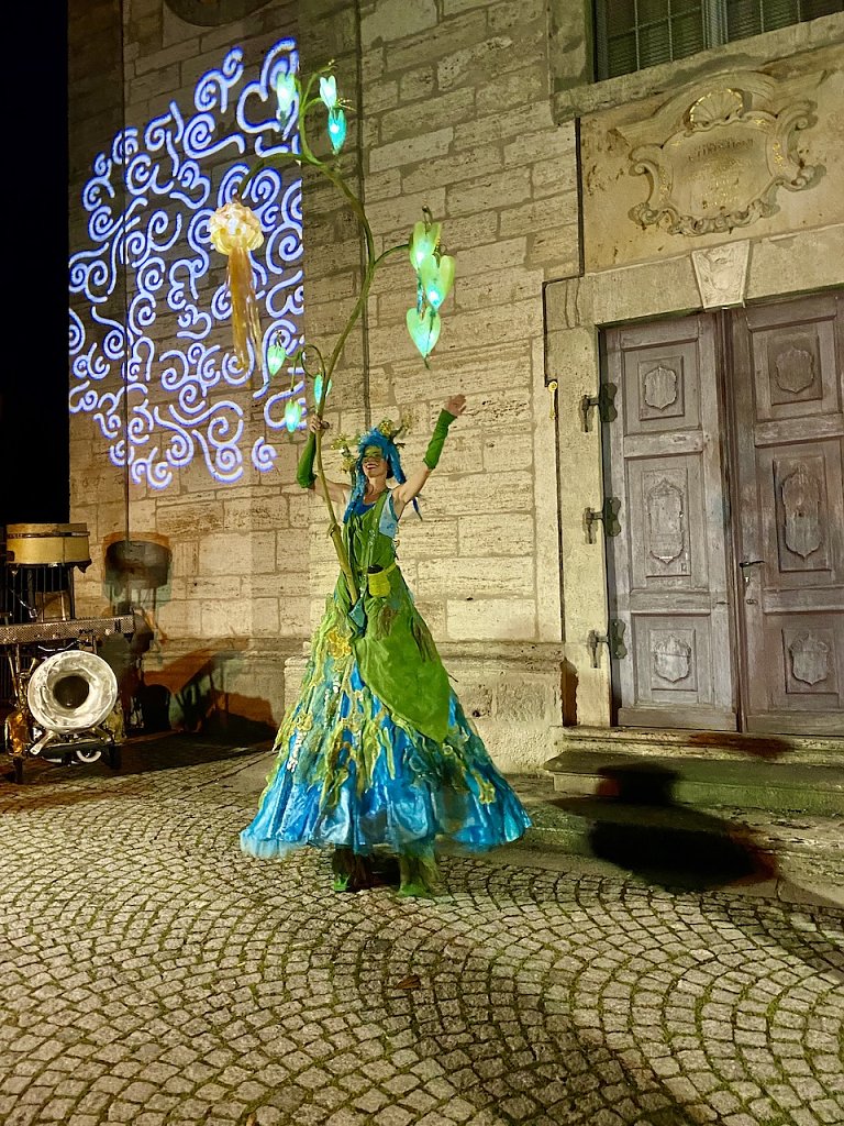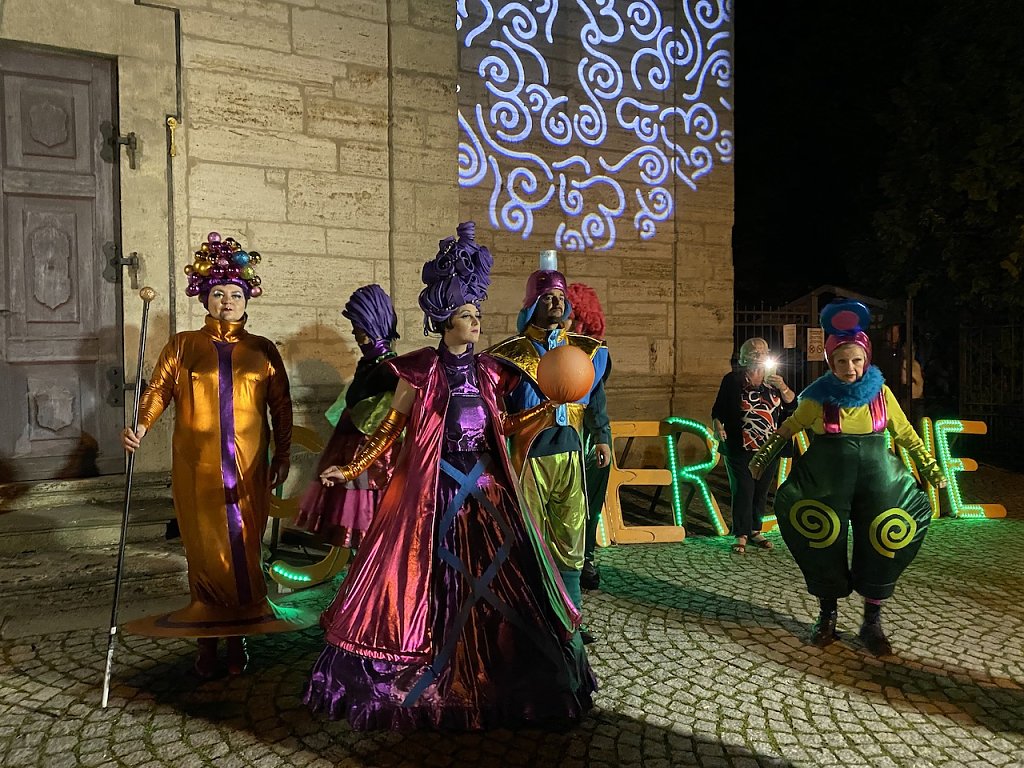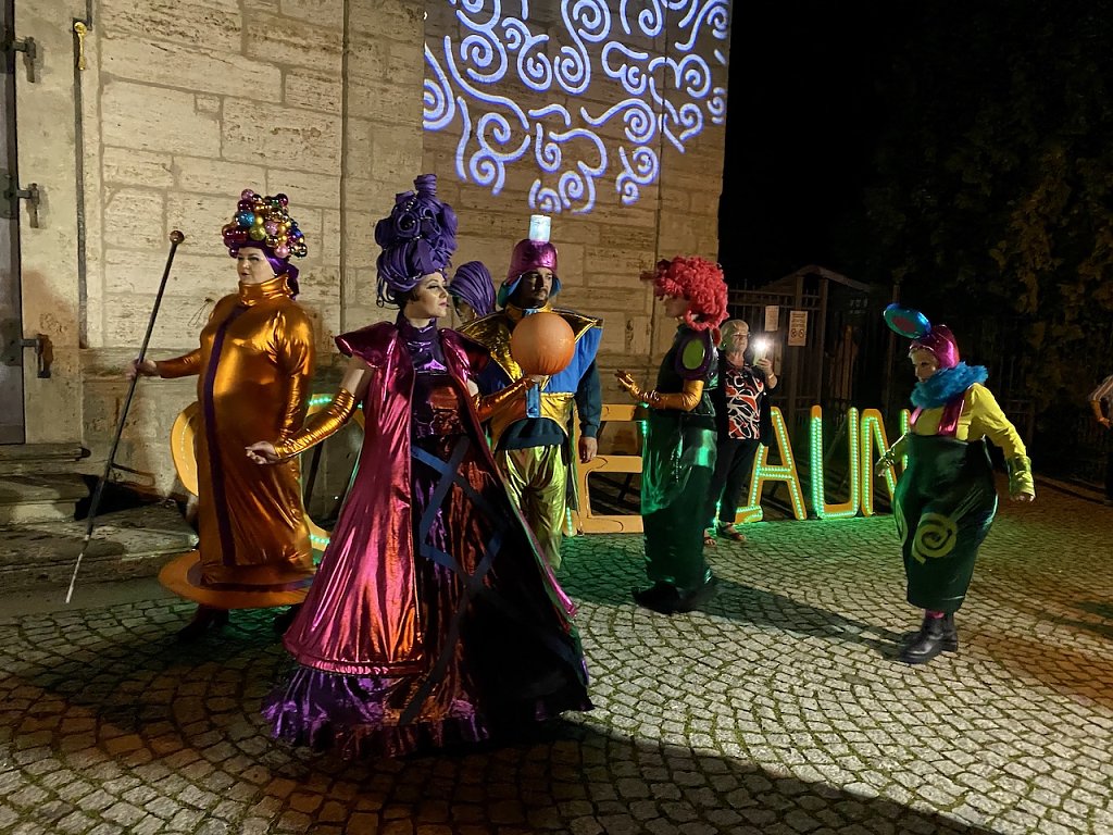 Der Kaosclown Kaos in Orange machte mit Slapstick, Gags und verrückten Ideen seinem Namen alle Ehre. Das Modetheater Gnadenlos Schick präsentiere seine avantgardistischen Outfits und fröhlichen Garderoben mit überaus professionell inszenierten Walking Acts.
