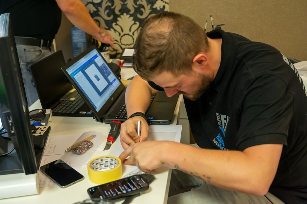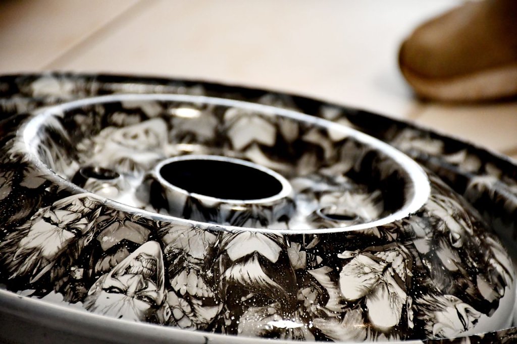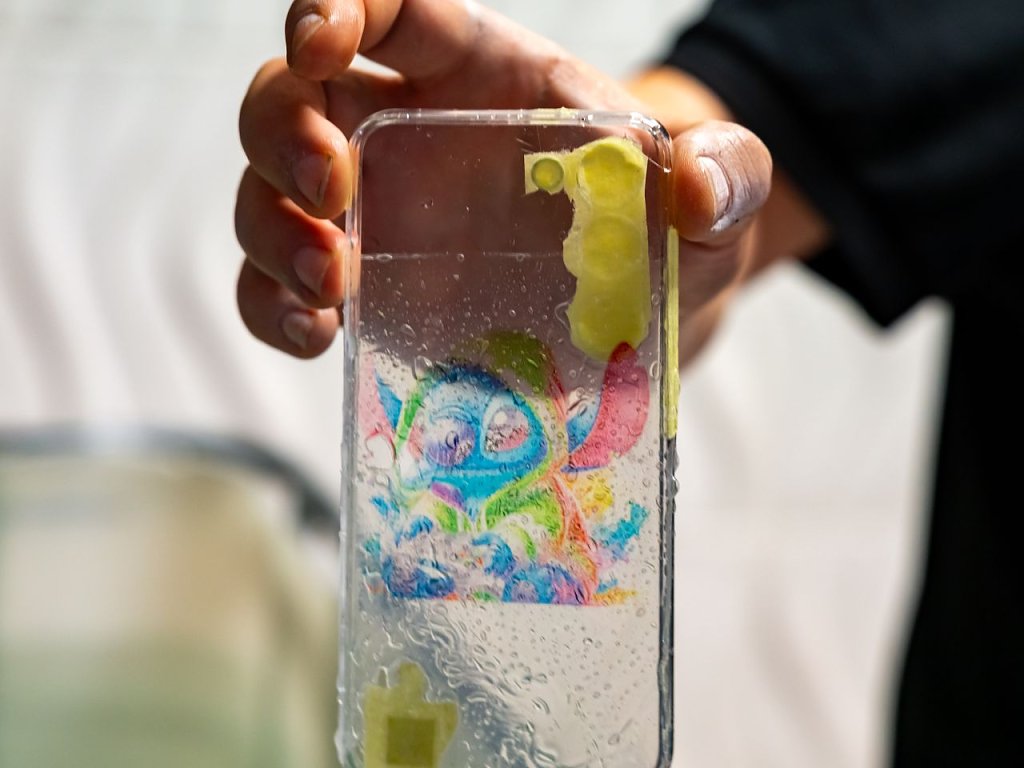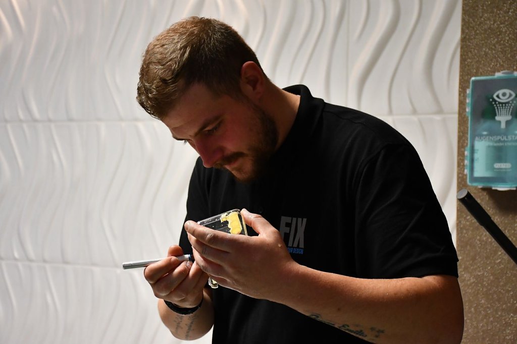So erhielt eine Handyhülle zum Beispiel ein neues Design. Das Motiv wurde ausgesucht, auf Folie gedruckt und ins 33 Grad heiße Wassertransferbecken getaucht, damit sich Wasser und Folie verbinden konnten. Anschließend ging die Folie auf die Handyhülle und das Produkt konnte trocknen. Neben der Handyhülle erhielt zum Beispiel auch eine Autofelge ein neues Design.