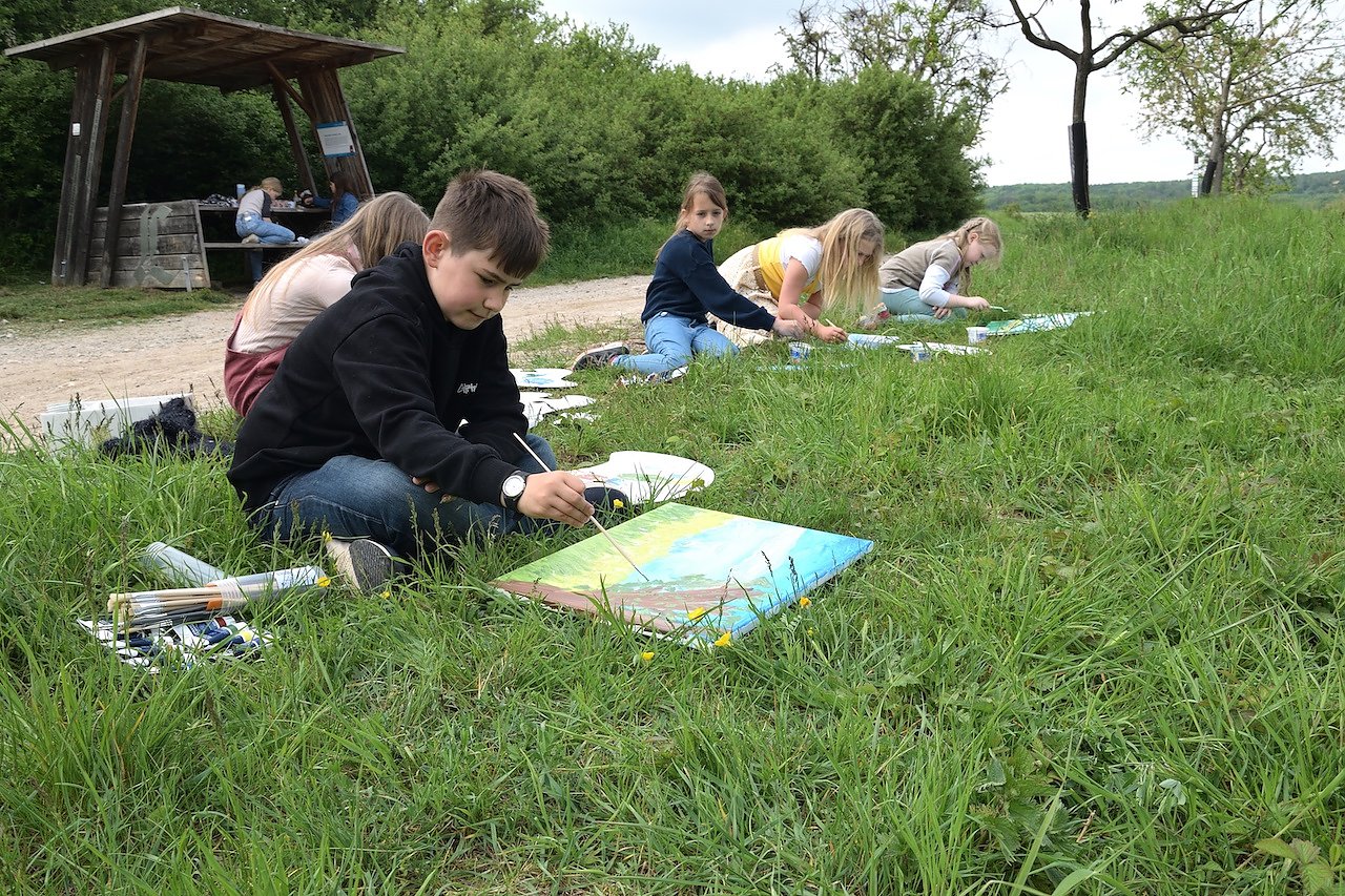 Im vergangenen Halbjahr malten die Kinder nach der Fertigstellung ihrer Wettbewerbsbeiträge für die 13. JugendKunstBiennale des nordthüringischen Städtenetzes SEHN, an der sich dieses Mal alle Kinder des Kurses beteiligt hatten, in der freien Natur auf ihre Leinwände Landschaften mit Acrylfarben.