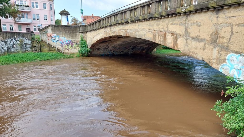 Stark steigende Pegelstände an Helme und ZorgeDie Meldestufe 3 an der Helme in Sundhausen wurde überschritten. Die Stadt Nordhausen bereitet das Befüllen von Sandsäcken vor.