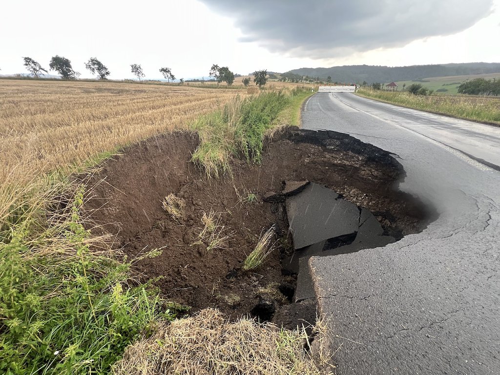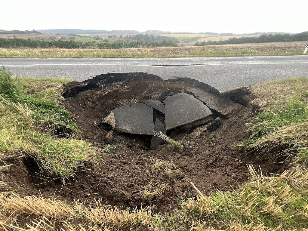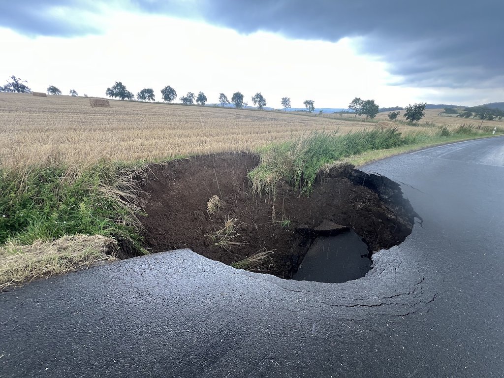 Durch den Starkregen sackte die Straße auf einer Fläche von rund 8 × 8 Metern und circa 4 Meter tief ab.