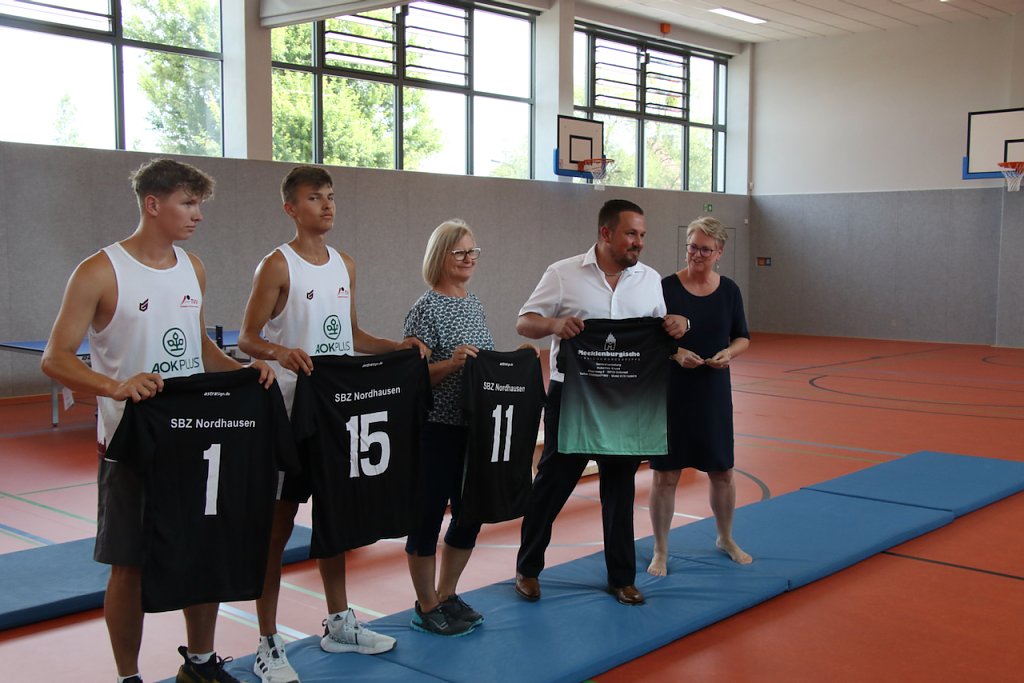 Zeitnah sind große Veränderungen aber nicht zu erwarten und die jungen Damen und Herren, die heute die Turnhalle einweihten, werden bei weitem nicht die letzten Berufsschüler sein, die sich hier sportlich austoben dürfen. Und damit die auch außerhalb der Halle als Einheit auftreten können, gab es zur Feier des Tages noch eine Überraschung - ein Satz Schultrikots, gesponsort von Versicherungsmakler Hubertus Kruse.