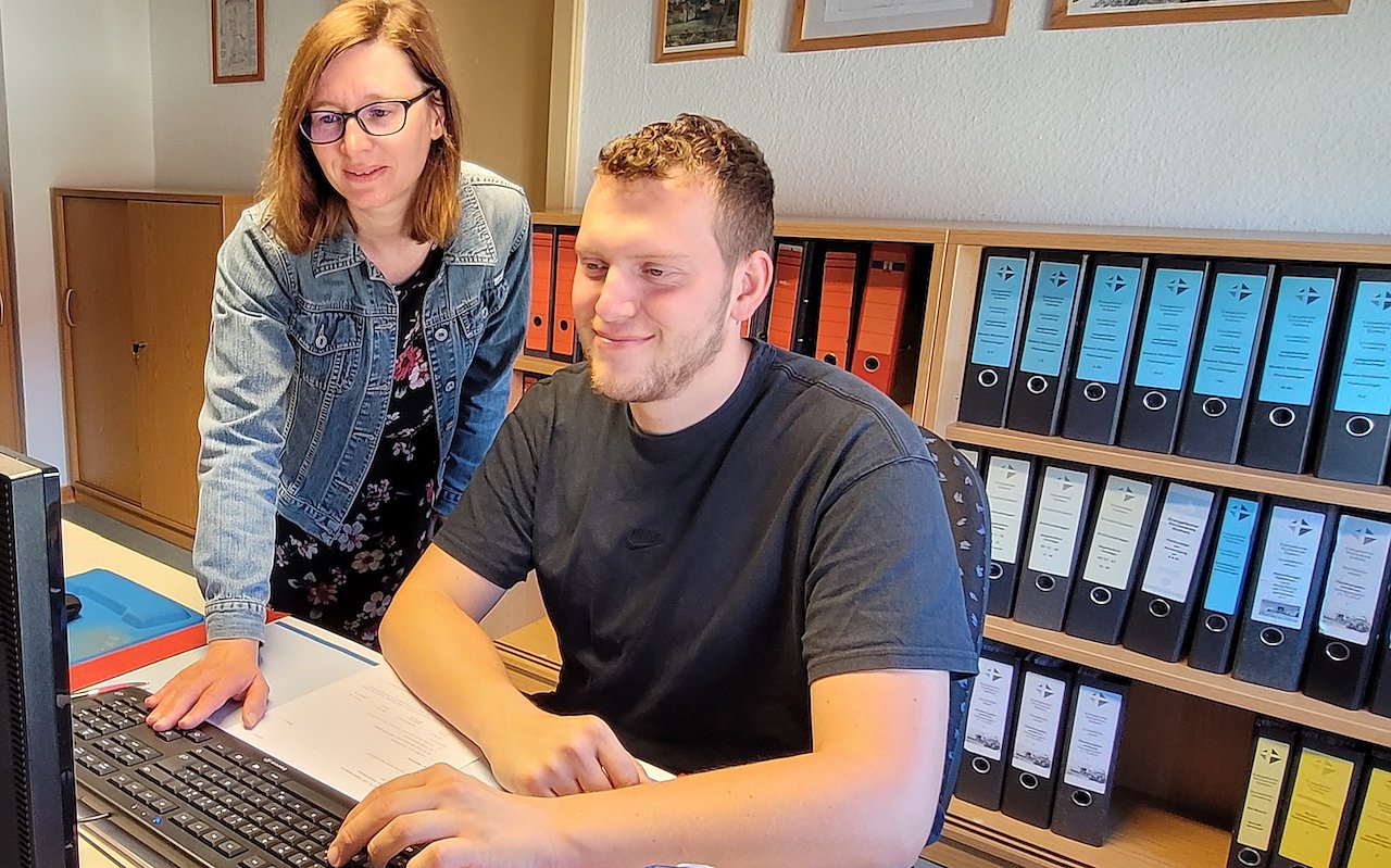 Das ist in den nächsten Wochen sein Arbeitsplatz. Yannick Hund ist der erste Auszubildende, den der Kirchenkreis Südharz eingestellt hat. In den nächsten drei Jahren wird der junge Mann zum Kaufmann für Büromanagement ausgebildet. Katja Ehrhardt steht ihm dabei zur Seite. Für beide ist es ein Anfang. Frau Ehrhardt hat zwar den notwendigen Ausbilderschein, aber bislang noch keinen Auszubildenden betreut.