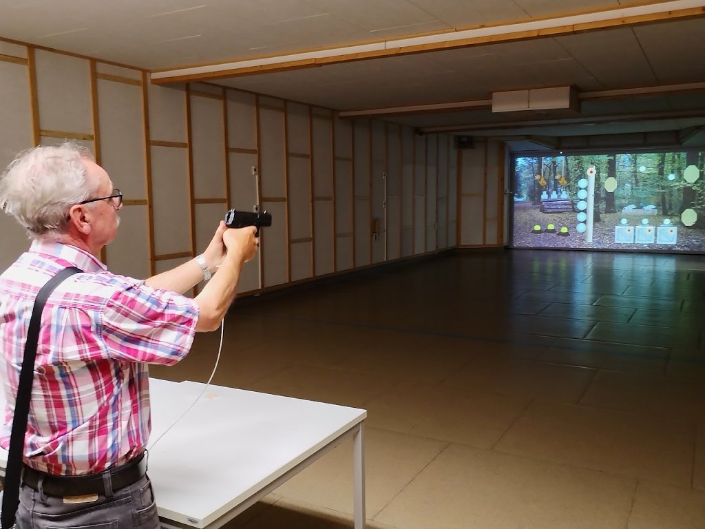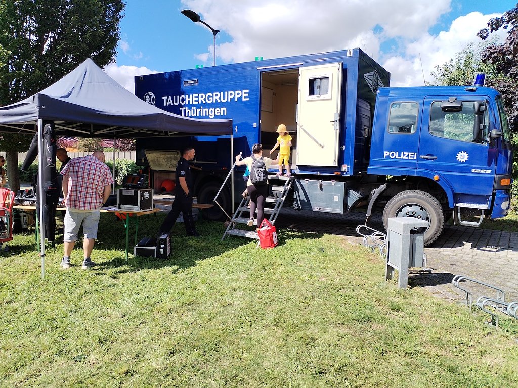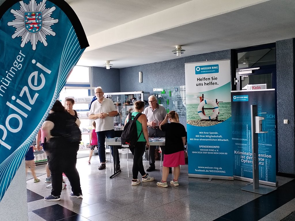 Die Tauchergruppe der Polizei war mit dabei und stellte ihre Ausrüstung vor, Einsatzfahrzeuge und Gewahrsamszellen der Polizei konnten besichtigt werden und wer wollte, konnte sich bei der Spurensicherung Fingerabdrücke nehmen lassen. Auch ein Erinnerungsfoto in der mobilen Gefängniszelle konnte aufgenommen werden. Im Rahmen des Tages wurde auch eine neue Kurzdistanzwaffe vorgestellt. Die war natürlich nur hinter Glas zu besichtigen. Wer dennoch einmal Lust zum Schießen hatte, bekam dazu im Kellergeschoss in der Raumschießanlage die Möglichkeit.