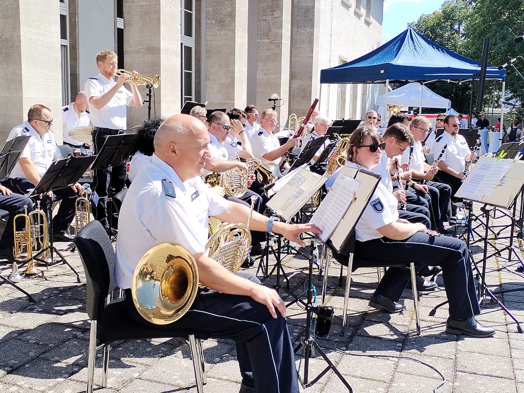 Im Außengelände gab es Vorführungen mit dem Wasserwerfer und das Polizeiorchester sorgte für musikalische Unterhaltung. Die vierbeinigen Kommissare der Diensthundestaffel Nord zeigten wieder ein tolles Programm, begleitet von den Rettungshunden Teamdogs. Ab 12.30 Uhr gab es eine Versteigerungsveranstaltung des Vereins Bürger und Polizei im Hue-de-Grais-Saal, bei der originale Gegenstände aus vergangenen Zeiten ersteigert werden konnten. Unter anderem Uniformen der Nationalen Volksarmee der ehemaligen DDR.