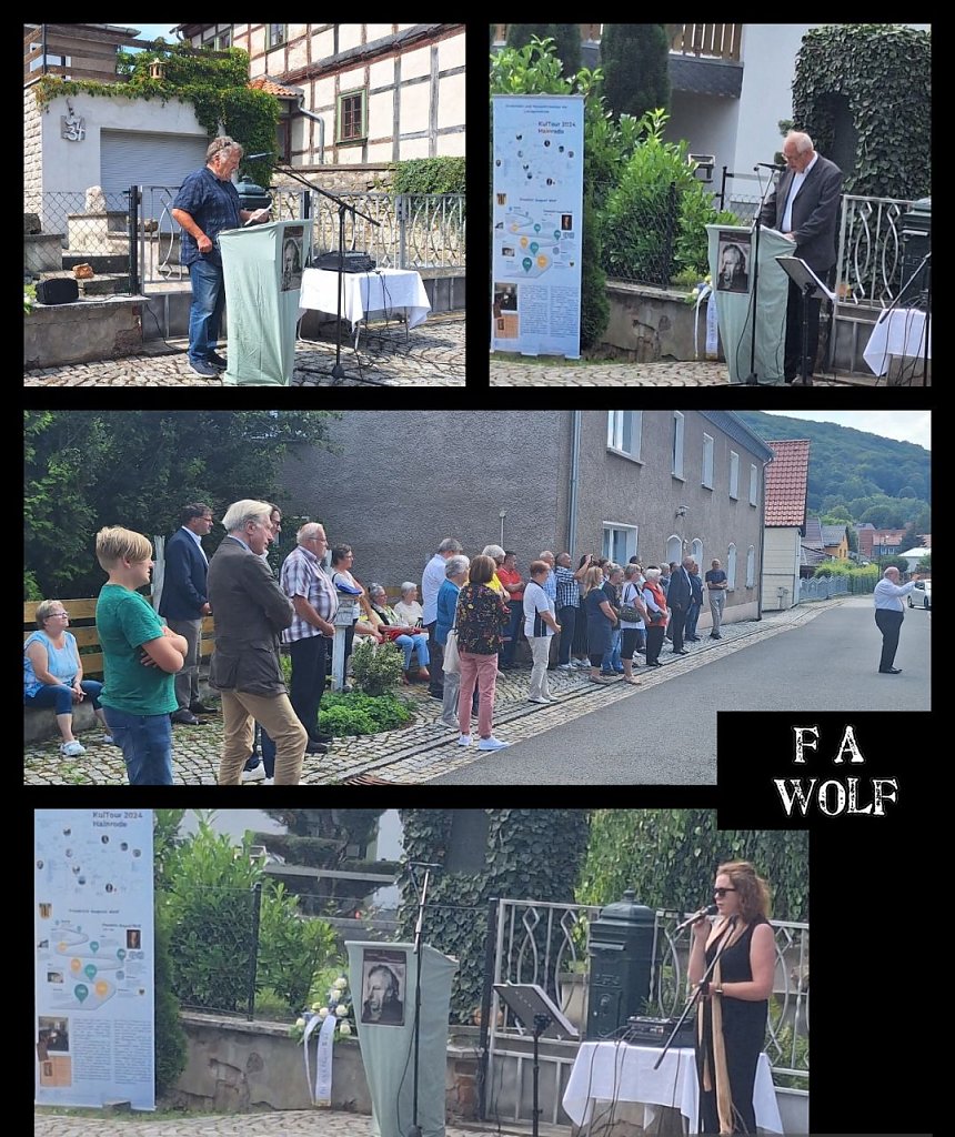 Am Denkmal vor der Kirche wurde ein Blumenschmuck niedergelegt und Gerhard Kindervater hielt eine würdige und lehrreiche Gedenkrede. Herr Wolf Mohs und seine Tochter Katharina Mohs brachten 3 Stücke des Bruders von Fr. A. Wolf, von dem Musiklehrer und Komponisten Georg Friedrich Wolf, zu Gehör.