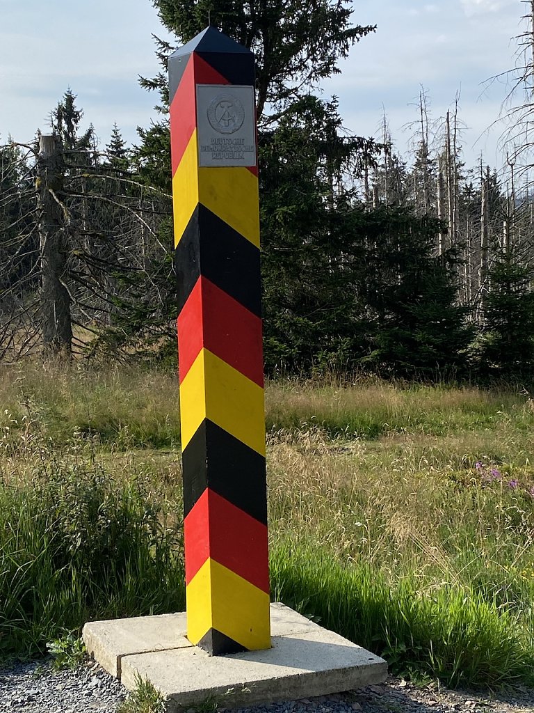 Auf dem ehemaligen Kolonnenweg und dem letzten Stück der Brockenchaussee gibt es gewaltige Anstiege zu bewältigen. Zunächst laufen wir am Bodemoor entlang. Das ist ein für den Harz typisches Hochmoor. Schließlich erreichen wir den Dreieckigen Pfahl. Dieser Punkt markiert schon seit Jahrhunderten verschiedene Grenzverläufe. Nach dem Ende des zweiten Weltkrieges verlief hier die innerdeutsche Grenze. Heute verläuft hier die Landesgrenze zwischen Niedersachsen und Sachsen- Anhalt.