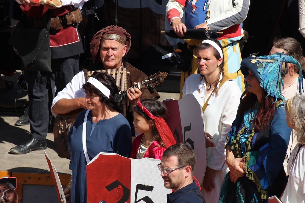 Es blieb dem Oberhaupt der Stadt, Matthias von der Salza, vorbehalten, die ersehnten Worte zu sprechen: Das 30. Mittelalterstadtfest ist eröffnet! Vorausgegangen war dem ein feierlicher Zug vom Rathaus zum Töpfermarkt, begleitet von Hunderten von Schaulustigen aus aller Welt. Eingereiht hatten sich Stars und Programmhöhepunkte aus dreißig Jahren Festivitäten in Bad Langensalza, um von den Honoratioren auf der Bühne des Töpfermarkts und dem Publico um den schon für die Reiterspiele präparierten Platz frenetisch bejubelt zu werden.