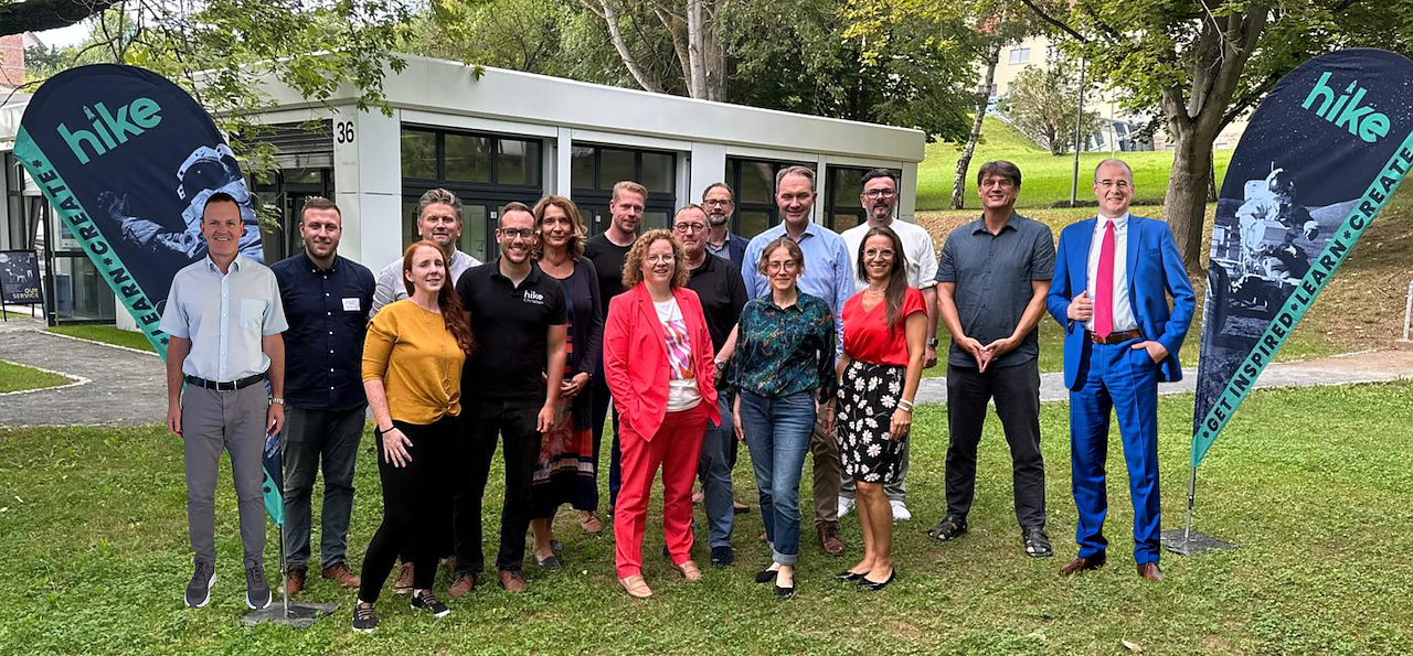 Bildbeschreibung Gruppenbild: vor dem Hike Lab von links nach rechts: Prof. Dr. Jörg Wagner (HS NDH), Jonas Mielke (hike), Sharon Keegan (hike), Prof. Dr. Lutz Göcke (hike), Christian Zoll (hike), Jana Zöller (EVN), Wolf Goertz (Future Forest Initiative), Franziska Baum (MdL, FDP), Karl-Heinz Land (Neuland AI AG), Burkhard Zinner, Johanna Vargas (hike), Dr. Ralf Kuschnereit (Jenoptik AG), Dr. Kareen Schlangen (HS NDH), Thomas Herwig (HS NDH), Prof. Dr. Andreas Seidel (inklukids; HS NDH), Landrat Matthias Jendricke (LK Nordhausen); nicht auf dem Bild: Jakob Janssen (Readay; HS NDH), Thomas Fülder (Dori; HS NDH). (Foto: Foto: HSN | Fotomontage Landrat Jendricke © Marco Kneise)