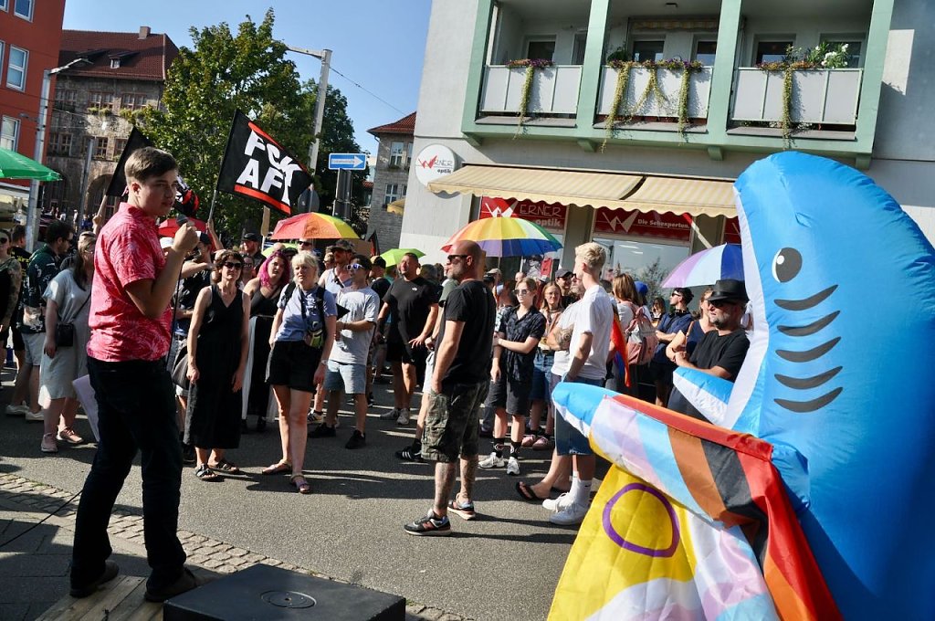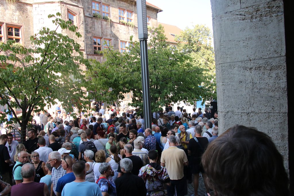 Knapp 500 Zuhörer bekam die AfD laut Polizei auf dem Rathausplatz zusammen, etwa 200 sollen es bei der Gegendemo in der Weberstraße gewesen sein. Vor einem Jahr hatte man fast die gleiche Szenerie, am gleichen Ort, aber da war bei der Alternativen noch mehr Silber auf den Häuptern zu sehen. Heute fand sich ein stärker gemischtes Publikum ein und erwartete den Star der Thüringer Alternativen, Björn Höcke.