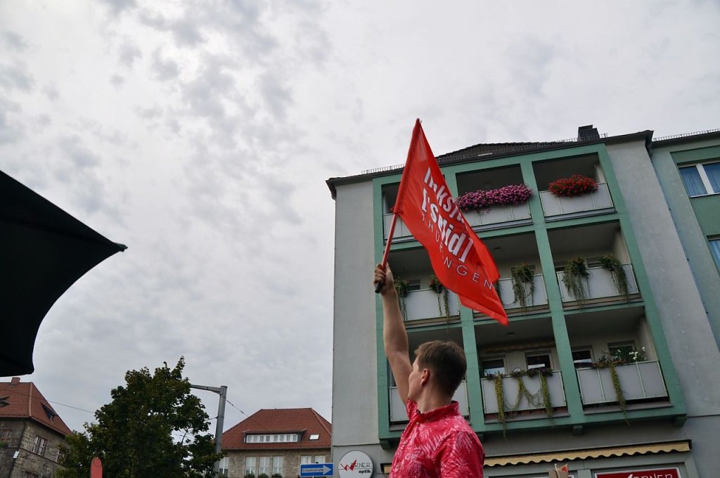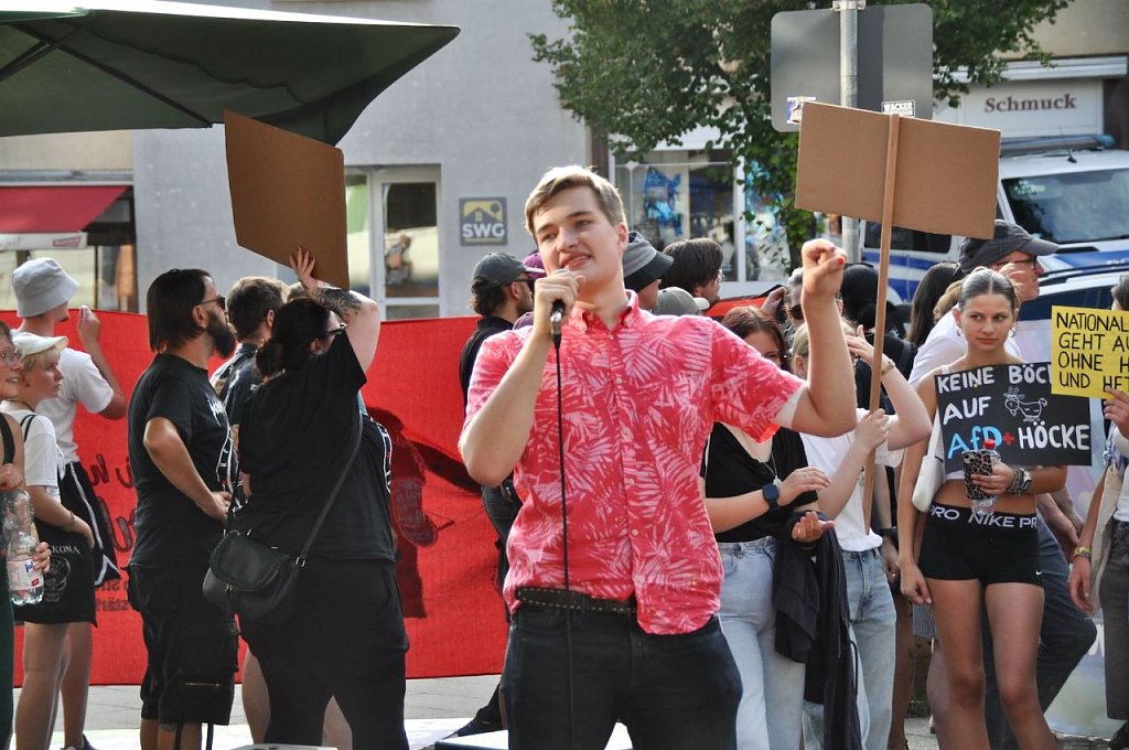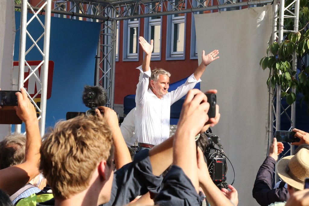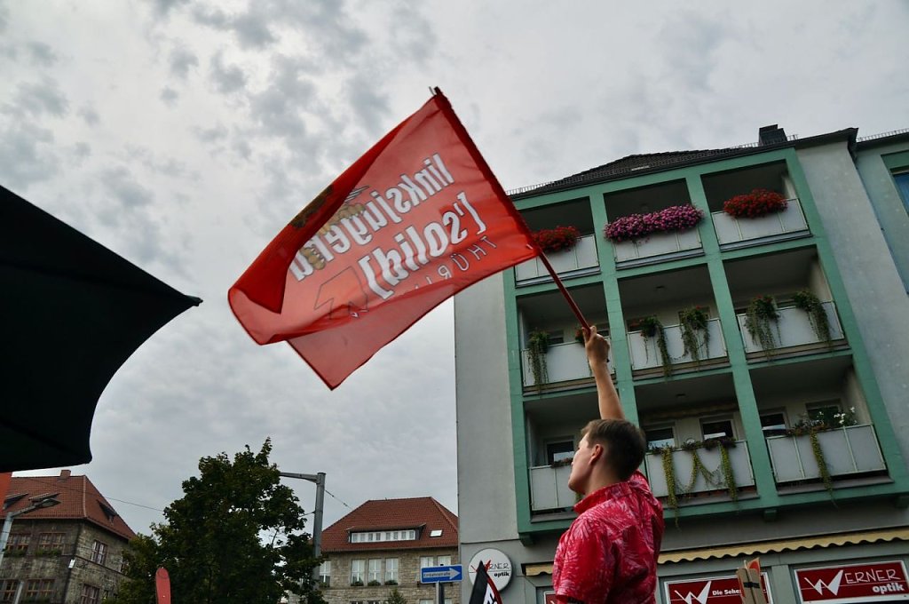 In dem Tonfall geht es weiter, das Publikum applaudiert, in der Weberstraße versucht man lautstark dagegen zu halten, ohne viel Erfolg. Das Bürgerfest geht ohne größere Zwischenfälle zu Ende. Es wird nicht der letzte Auftritt von Prophet und Höcke gewesen sein, wenn in einem Jahr Bundestagswahl ist, will man wieder auf den Rathausplatz kommen.