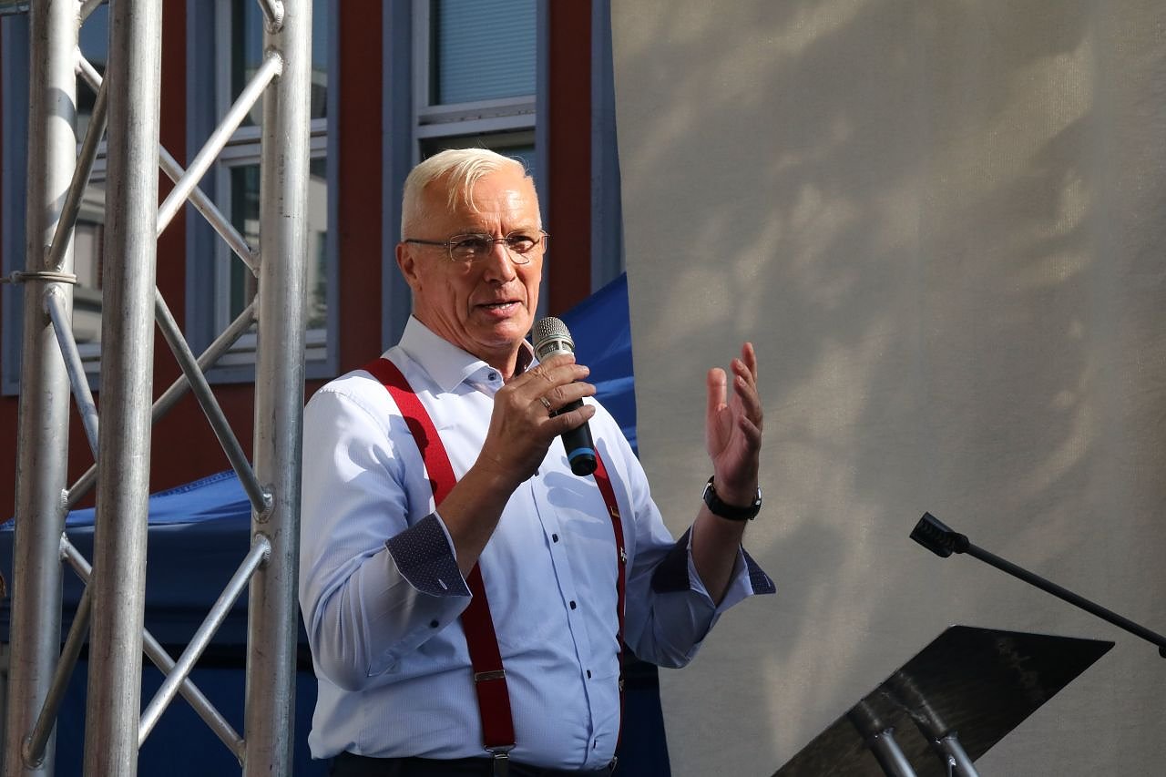 Prophet steht energiegeladen auf der Bühne, peitscht kräftig ein, driftet mitunter auch ins Schreien ab. Auf der Gegenseite stünden Mauerschützen im Geiste, allein die AfD traue sich noch raus zum Volk, mehr Europa, mehr Windkraft, mehr Subventionen könnten nicht der Weg in die Zukunft sein. Der Unternehmer fokussiert weiter auf Wirtschaftsthemen und fährt Attacken gegen die politischen Gegner. Die CDU habe die Souveranität des Landes aufgegeben, angefangen bei der D-Mark. Viele große Unternehmen hätten sich ins Ausland wegstohlen, was unpatriotisch sei. Nach zehn Jahren mit einem kommunistischen Ministerpräsidenten sei in Thüringen die Zeit für den Wechsel gekommen.