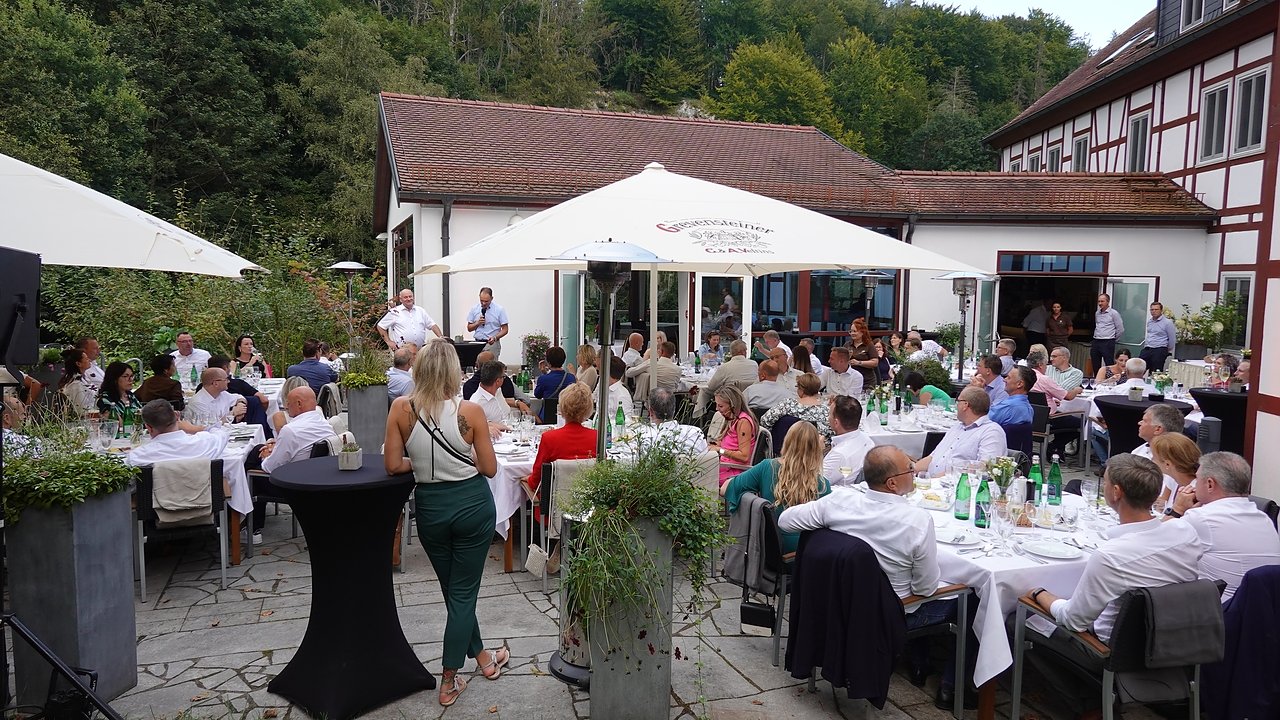 Nach de Zahlen in der Halleschen Straße sollte es in der Kalkhütte dann nicht nur lockerer, sondern vor allem genüsslicher zugehen. Zu den Damen und Herren aus der Bankenwelt gesellten sich Freunde und gute Bekannte von Andreas und Helmut Peter hinzu. Rund 80 waren es am gestrigen Abend.