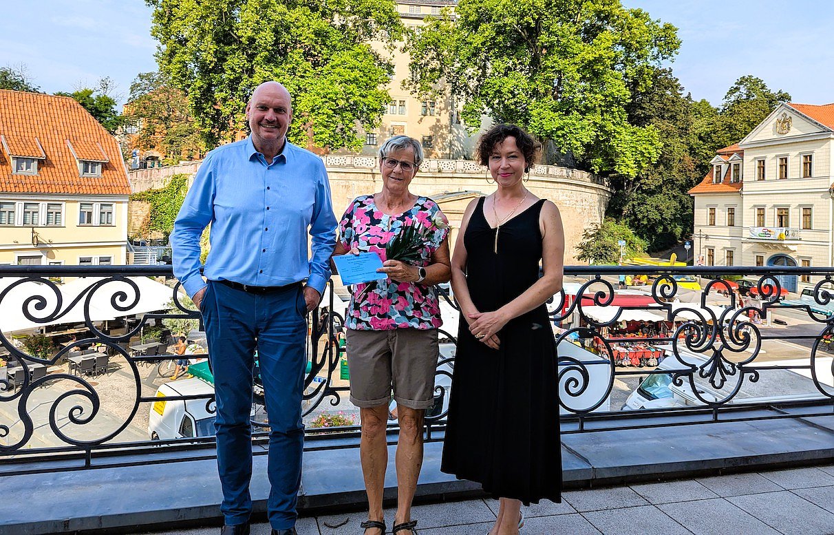 Heute erhielt sie aus diesem Anlass von Bürgermeister Steffen Grimm und Claudia Langhammer (Stabstellenleiterin Kultur, Tourismus, Wirtschaftsförderung) eine Jahreskarte für die kommende Badesaison 2025 im Bergbad "Sonnenblick".