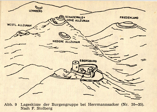 Zur Burgengruppe Ebersburg bei Hermannsacker, vor 1190 als Schloss Ebersberc erwähnt, zählen Friedenland,1271 mons Vredelant, Schadewald, Lehnberg, niedere und westliche Allzunah (vgl. F. Stolberg), deren Erbauung ab 1247 angegeben ist. 1199 wird ein Heinrich von Eversberch als Marschall des Landgrafen von Thüringen erwähnt (Ebersburg-Hermannsacker).