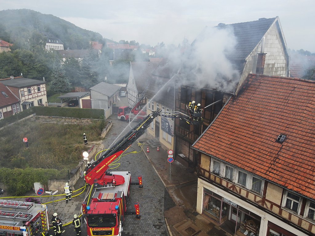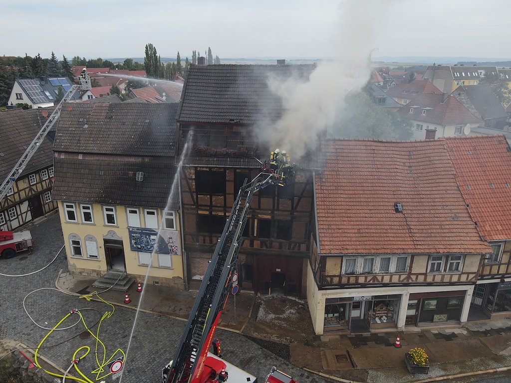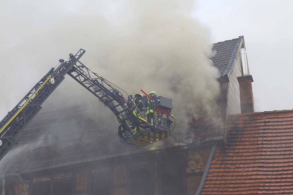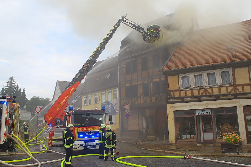 Schnell waren die Löschkräfte auch aus Obergebra, Elende und schließlich aus Wolkramshausen mit der Drehleiter vor Ort, um das Haus in der Hauptstraße (Ecke Weberstraße) abzulöschen. Das leerstehende Gebäude war zum Abriss vorgesehen, der Strom abgeschaltet, so dass bspw. ein Kurzschluss als Brandursache ausgeschlossen werden kann. Weil eine mögliche Brandstiftung für das Feuer verantwortlich sein könnte, ermittelt nu die Kriminalpolizei in Bleicherode.