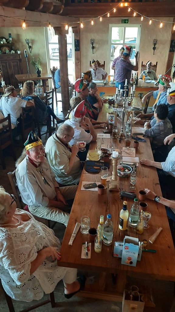 Wichtig ist, dass bei besonderen Anlässen, wie diesmal, auch die Burgfrauen dabei sind und mitfeiern. Auf Burg Hohenstein anwesend waren fast zwei Dutzend Ritter mit ihren Frauen aus 13 Reychen: unter anderem aus Braunschweig, Coburg, Erfurt,Weimar, Halle, Gera und Leipzig, Heidelberg, Mainz, Peine. Und auch neun sogenannte Pilger (Nichtschlaraffen) machten mit – besser: Sie beobachteten und bestaunten eher das lustige Treiben.