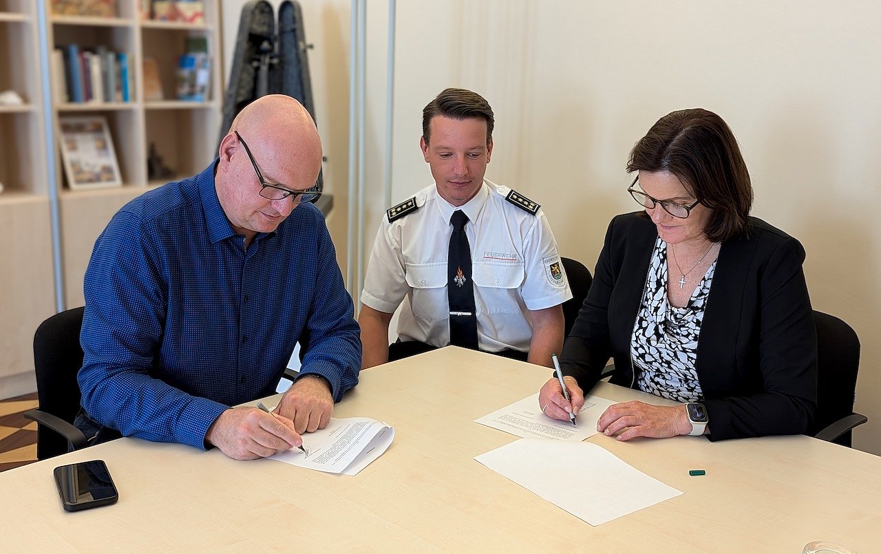Unterzeichnung des Sirenen-Kooperationsvertrages v.li.n.re. Bürgermeister Steffen Grimm; Brandkreisinspektor Jonas Weller, Landrätin Antje Hochwind-Schneider (Foto: Martin Hellmann)