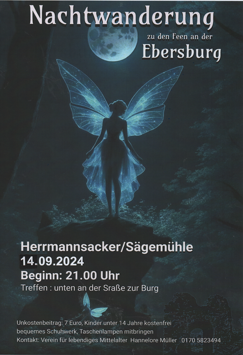 Es ist wieder soweit: auf der Ebersburg bei Herrmannsacker feiert man den Tag des offenen Denkmals wie immer mit einer Woche Verzögerung. Das heißt: am Sonntag, den 15.9., wird zwischen 12 und 19 Uhr das kleine Burgfest gefeiert.
