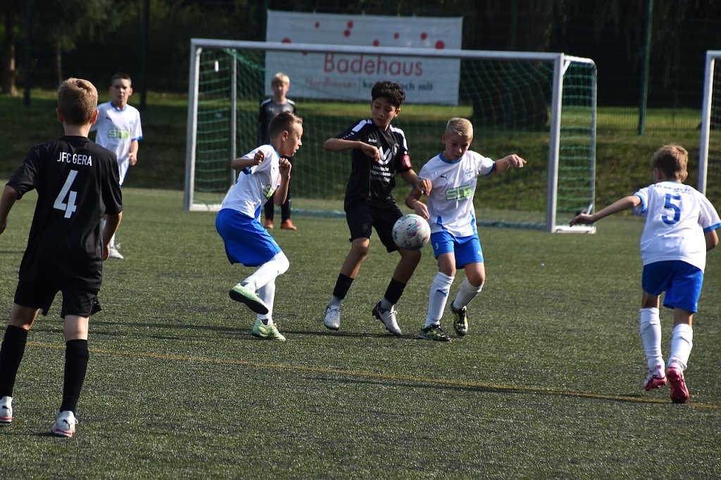 Obwohl auch in diesem Spiel der Altersunterschied zu Gera meist ein Jahr betrug, wollten wir das Spiel zu unseren Gunsten entscheiden. Doch bereits in der 3. Spielminute bekamen wir einen Dämpfer. In der eigenen Spielhälfte wurde der Ball verloren, anschließend die Zweikämpfe verloren, das Abwehrzentrum ausgespielt und zum 0:1 abgeschlossen. Auch in der 5. Minute hatten wir Glück, als zwei unserer Abwehrspieler angeschossen und damit die Torschüsse verhindert wurden. Unsere erste sehenswerte Aktion führte zum Ausgleich. Hugo Pabst griff die gegnerische Abwehr an, eroberte den Ball und vollendete zum 1:1 Ausgleich.