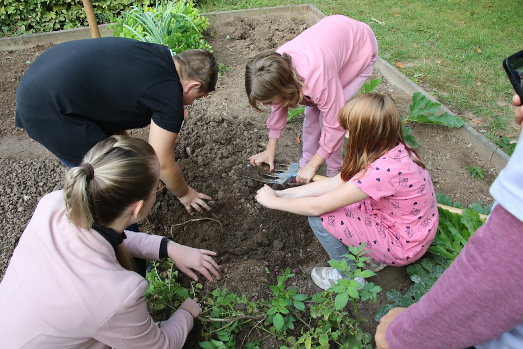 Der Schulgarten am Geiersberg kann also auch in der nächsten Saison beackert werden. Die reiche Ernte landet derweil nicht irgendwo, sondern häufig im Hauswirtschaftsunterricht der größeren Klassen oder auf den Tellern des Schülercafés. Mit Jungpflanzen die man auf dem Markt am Rathaus verkauft hat konnte man ein paar Euro zusätzlich verdienen, die wieder in den Schulgarten fließen und eine getrocknete Kräutermischung ergibt ein schönes, kleines Weihnachtsgeschenk für die Eltern. Auch die jüngste Ernte ist schon verplant: nächste Woche steht Kartoffel-Bohnensuppe auf dem Speiseplan.