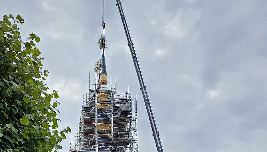 Im Ellricher Zentrum ist gerade einiges los, am Markt haben Dreharbeiten für eine Film begonnen und nebenan an der Johanniskirche wachsen die neuen Türme weiter in die Höhe. Heute morgen erreichte man beim Kirchenbau einen wichtigen Meilenstein: die Spitzen wurden auf die Türme gesetzt und die Glocken an ihre Position gebracht.