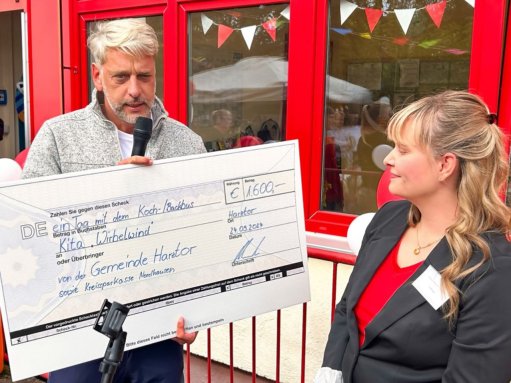 Harztor-Bürgermeister Stephan Klante war nicht nur als Gratulant anwesend, sondern hatte auch ein besonderes Geschenk im Gepäck: einen Gutschein im Wert von 1.600 Euro für ein Koch-Mobil, das bald den Kindergarten besuchen wird. In diesem Mobil können die Kinder ihr Lieblingsessen selbst zubereiten und dabei spielerisch den Umgang mit Lebensmitteln lernen.