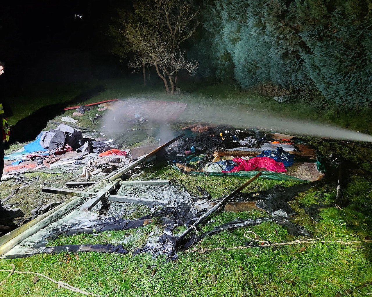 Beim Eintreffen der Feuerwehr war die Jurte bereits vollständig abgebrannt.Die Feuerwehr löschte noch einzelne Glutnester ab und kontrollierte die Brandstelle mehrfach.