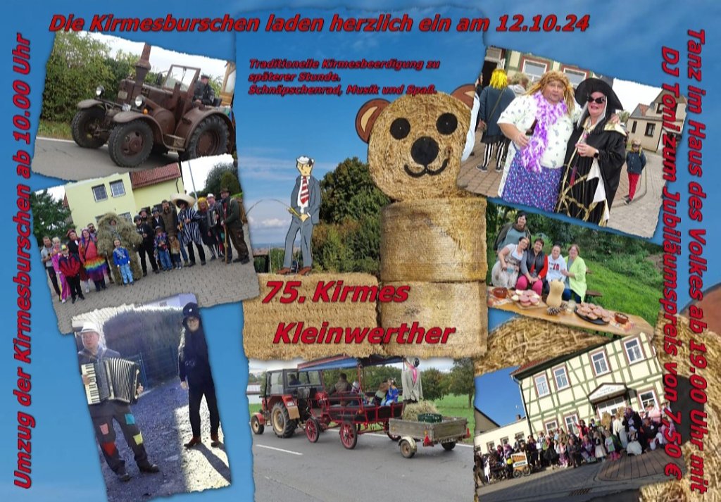 Es erwartet euch ein historisch interessanter Rückblick auf 75 Jahre Kirmes Kleinwerther. Zu später Stunde findet nach alter Tradition die Kirmesbeerdigung statt. Wir freuen uns auf euren Besuch."