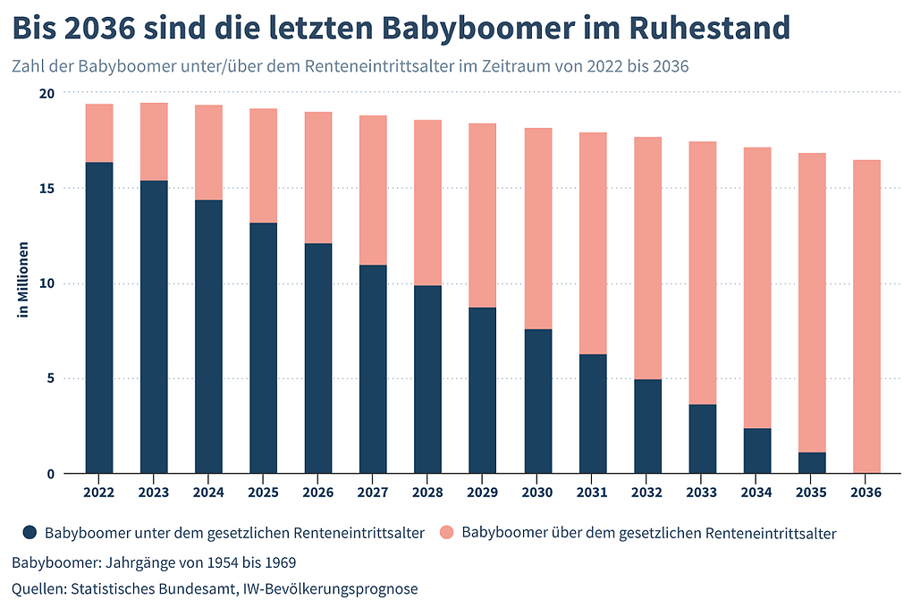 Jahrzehntelang hat der deutsche Arbeitsmarkt von den geburtenstarken Jahrgängen zwischen 1954 und 1969 profitiert. Nun sind die ersten Babyboomer im Rentenalter angekommen. Im Jahr 2022 erreichten bereits mehr als drei Millionen Babyboomer das gesetzliche Renteneintrittsalter. Neue Auswertungen aus der IW-Bevölkerungsprognose zeigen jetzt, wie es in den kommenden Jahren weitergeht: Bis 2036 überschreiten demzufolge weitere 16,5 Millionen Babyboomer die Altersschwelle.