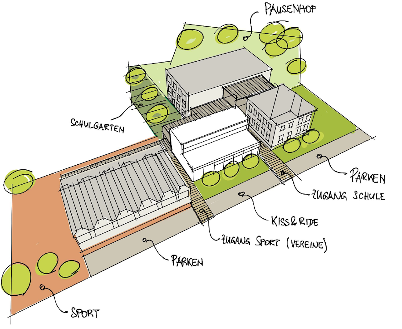Das schmucklose Außengelände wird durch einen Schulgarten und weiteren Begrünungen aufgewertet. Auch ein geräumiger Schulhof, Sportflächen und Parkplätze sind geplant.