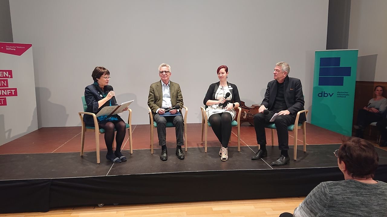 Eben jene Strahlkraft dürfte ihren Teil zur Jury-Entscheidung des Bibliothekspreises beigetragen haben, die heute mit dem ehemaligen Bundesinnenminsiter Dr. Thomas de Maizére und dem Vorsitzenden des Bibliotheksverbandes, Volker Heller, prominent vertreten war. Statt langer Festreden wurde die beiden Herren selbst zur Rede gestellt - auch das ein erfrischend anderer Ansatz für derlei Veranstaltungen.
