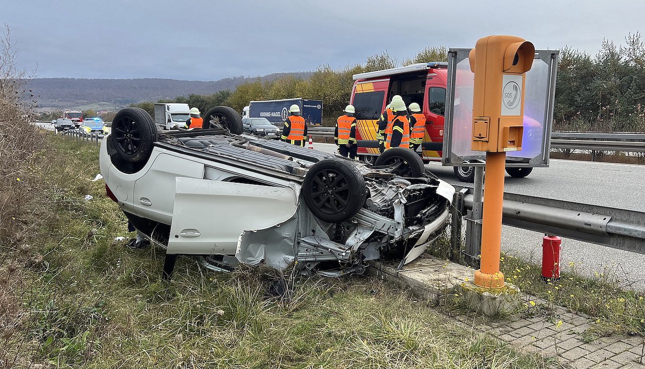Nach ersten Informationen fuhr ein 20-jähriger Mitsubishi-Fahrer mit seinem Fahrzeug in Fahrtrichtung Göttingen. Aus bisher ungeklärter Ursache kam der Fahrer auf Höhe Kilometer 53,5 auf gerader Fahrbahn nach rechts ab, durchfuhr auf 100 Meter den Straßengraben und prallte gegen eine Schilderpfosten, ehe sich das Auto überschlug und auf dem Dach an einer Notrufsäule zum liegen blieb.