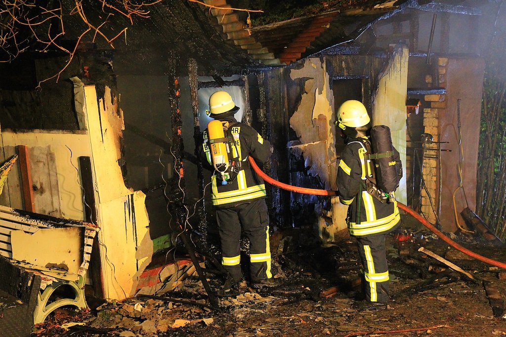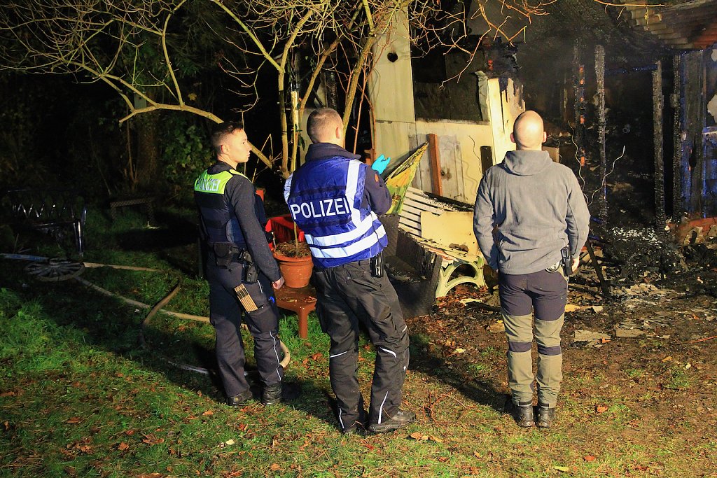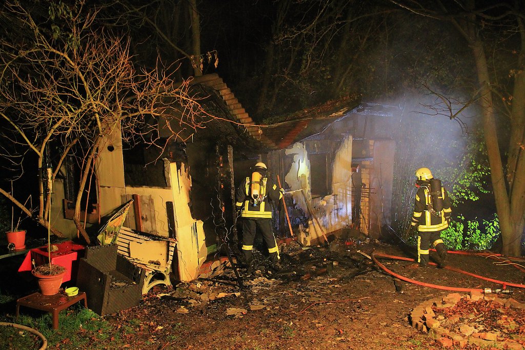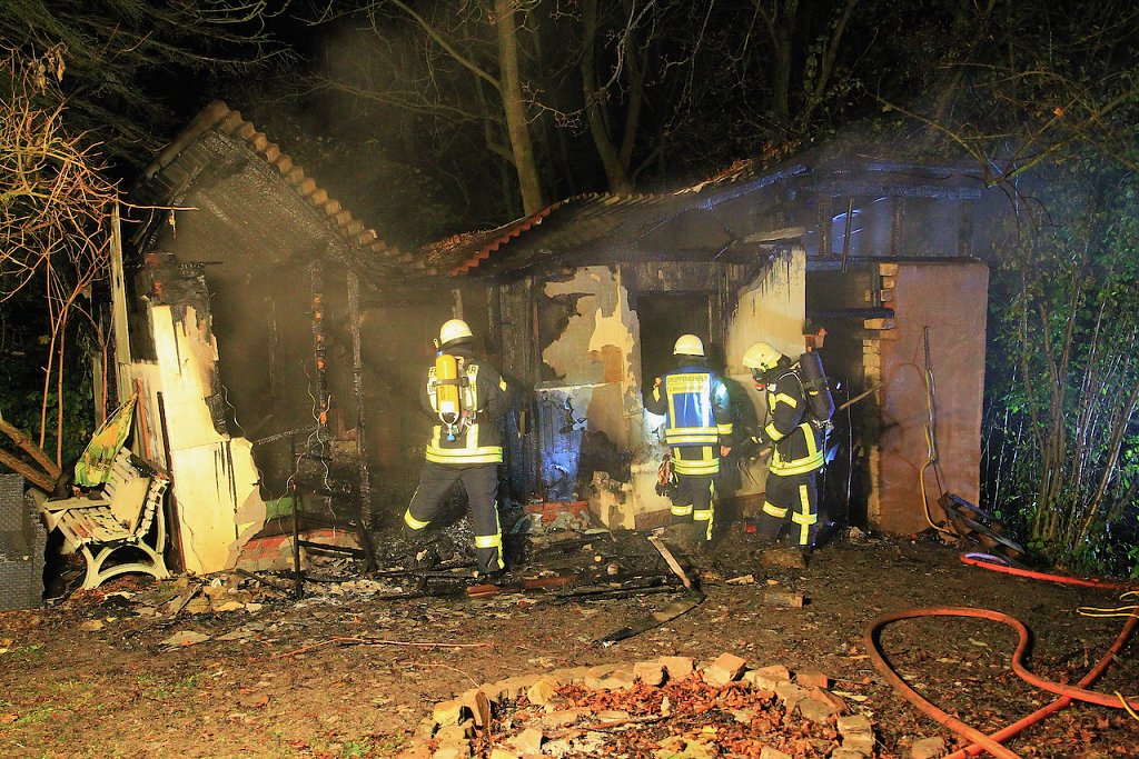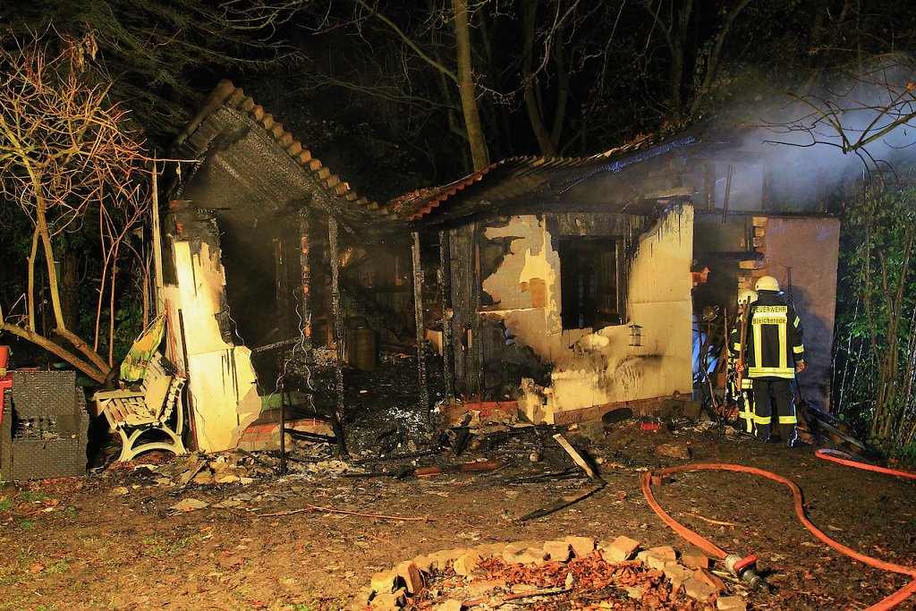 Von der Straße bis zum Brandobjekt sind es gut 75 Meter. Schläuche und Scheinwerfer müssen den Berg hochgetragen werden, nasses Laub und hohes Gras erschweren zudem, einen sicheren Weg zu finden. Zu retten ist die Gartenlaube, trotz schnellem Handeln der Einsatzkräfte, nicht mehr. Sie brennt völlig aus.