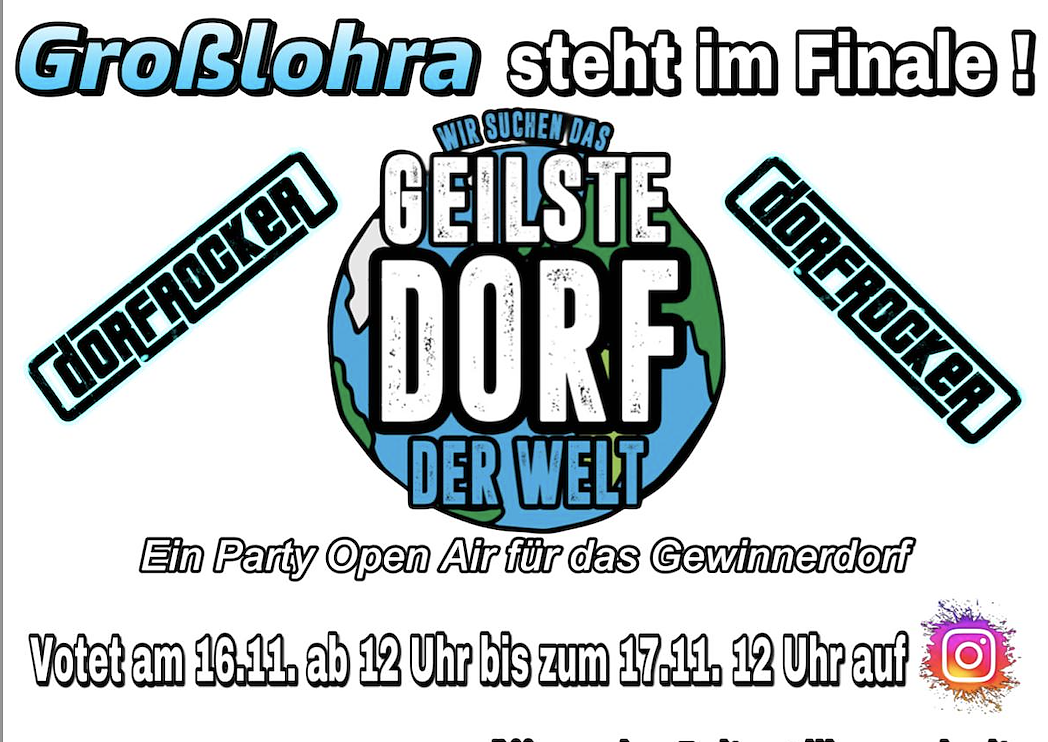 Wir wollen und können mit Eurer Unterstützung das geilste Dorf der Welt 2024 werden und freuen uns, mit Eurer Hilfe auf eine unvergessliche Open Air Party mit den Dorfrockern hier im Landkreis Nordhausen. Also alle fleißig am Samstag, den 16.11.2024 ab 12 Uhr bis zum Sonntag, den 17.11.2024 12 Uhr auf der Instagram-Seite der Dorfrocker für Großlohra voten. Zusammen holen wir die Dorfrocker zu uns, vielen Dank!