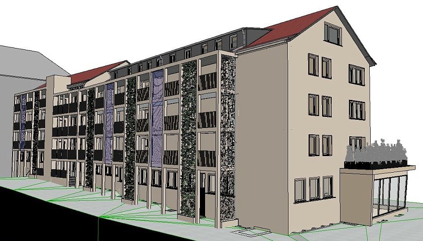 Für das Haus Rautenstraße 1 ist eine Komplexsanierung samt Laubengang hinter dem Haus geplant. Auch dieser muss aufgrund der schlechten Betonqualität umfangreich saniert werden. Für eine höhere Wohnqualität wird er als Vorzone mit Abstellräumen zu den Wohnungen umgenutzt.