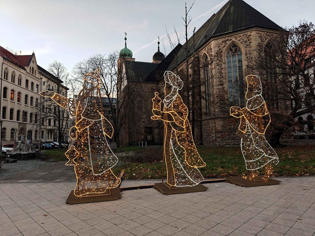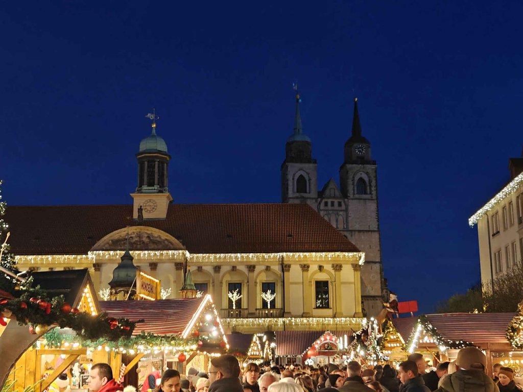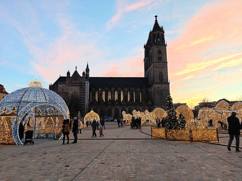 Der Magdeburger Weihnachtsmarkt hat schon am 22. November begonnen und endet am 29. Dezember. Am Samstagnachmittag strömten tausende Menschen in die Geschäfte und auf dem Weihnachtsmarkt. Vor dem Dom erstrahlte die Lichterwelt.