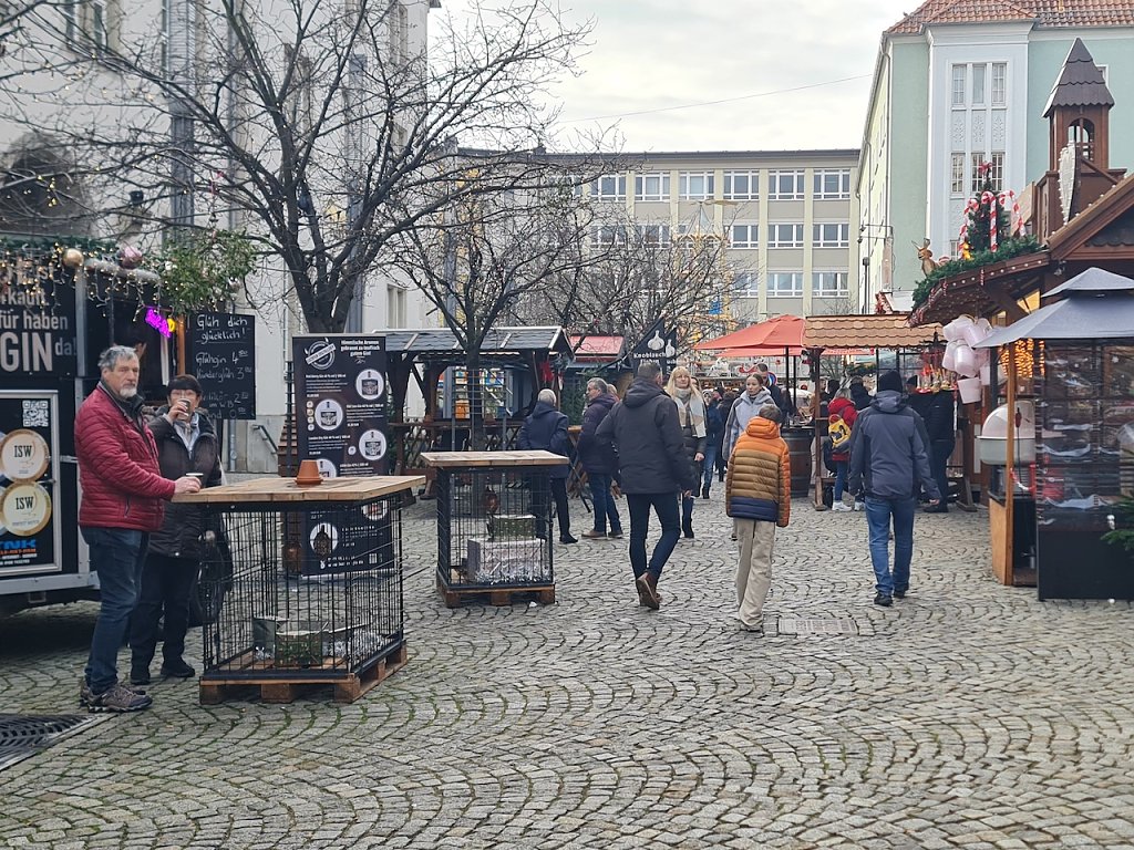 Wir laufen weiter in Richtung Rathausplatz. Der städtische Weihnachtsmarkt. Hier herrscht heute in den Nachmittagsstunden ein reges Treiben. Annett und Rene aus Bautzen waren beim Weihnachtsmarkt dabei: Wir mögen das Heimische und Gemütliche an diesen kleinen Weihnachtsmärkten wie bei diesem Nordhäuser Weihnachtsmarkt. In Quedlinburg waren wir gestern, aber da sind Massen unterwegs und man schiebt sich gefühlt nur gegenseitig durch die Gegend.