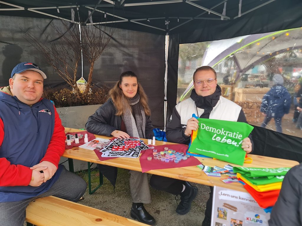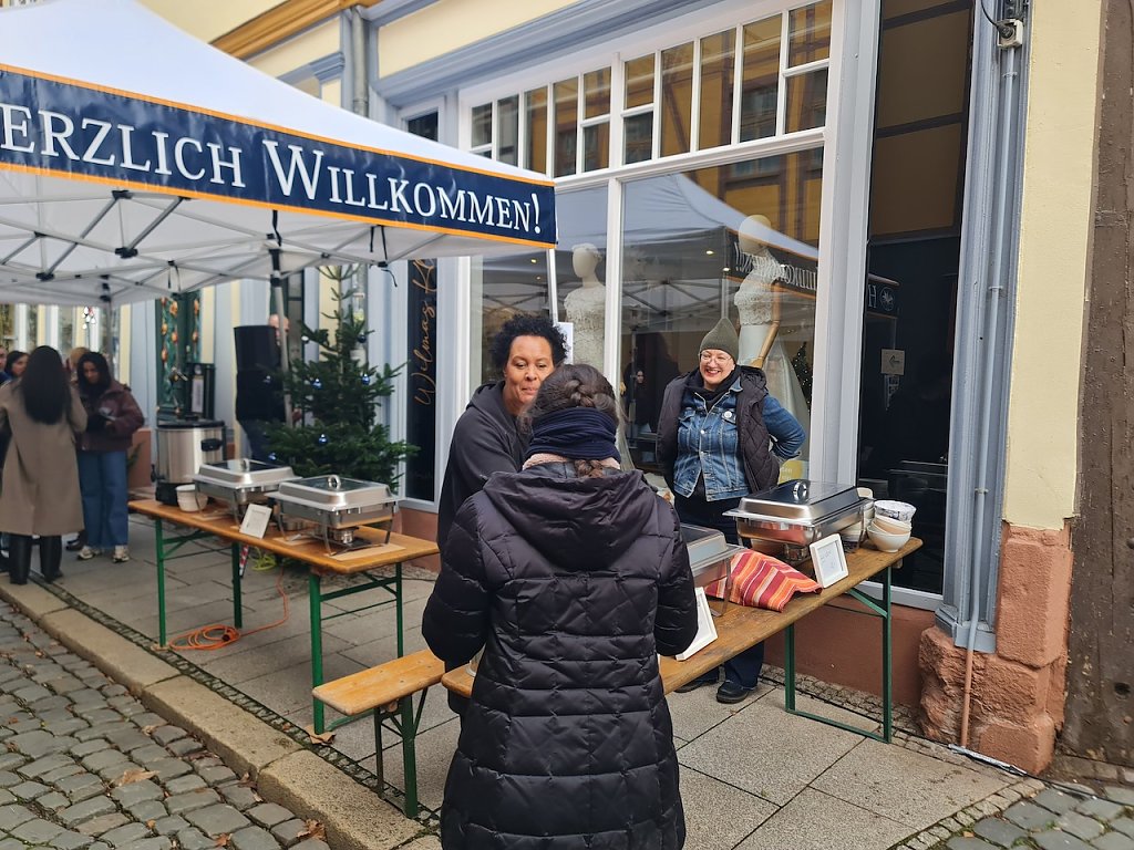 Gleich um die Ecke am Blasiikirchplatz ist die nächste Zwischenstation. Das Bündnis Nordhausen zusammen hat ebenfalls einen kleinen Markt organisiert, auf dem man selbstgenähte Kissen für die kalte Jahreszeit und auch Grillspezialitäten erwerben konnte. Im Kirchenladen hatte Familie Tuschy einen kleinen Handwerkermarkt aufgebaut, der guten Zulauf bekam. Weihnachstmann Jannis, der an der Fachhochschule Soziales studiert, konnte hier heute für einen guten Zweck Freude in die Herzen der Menschen bringen.