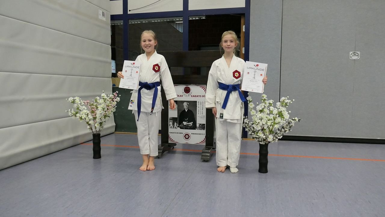Neben dem Training fanden aber auch noch die gleichermaßen ersehnt wie gefürchteten Gürtelprüfungen statt. Insgesamt 53 Karatekas stellten sich den Aufgaben und meisterten ihr vorgeschriebenes Programm bei den Schülergraden. Ganz besonders glücklich waren die Nordhäuserinnen Penelope und Magdalena. Direkt nach bestandener Prüfung überraschten ihre Eltern sie mit dem mitgebrachten blauen Gürtel, den die Mädels selbstverständlich gleich umbanden.