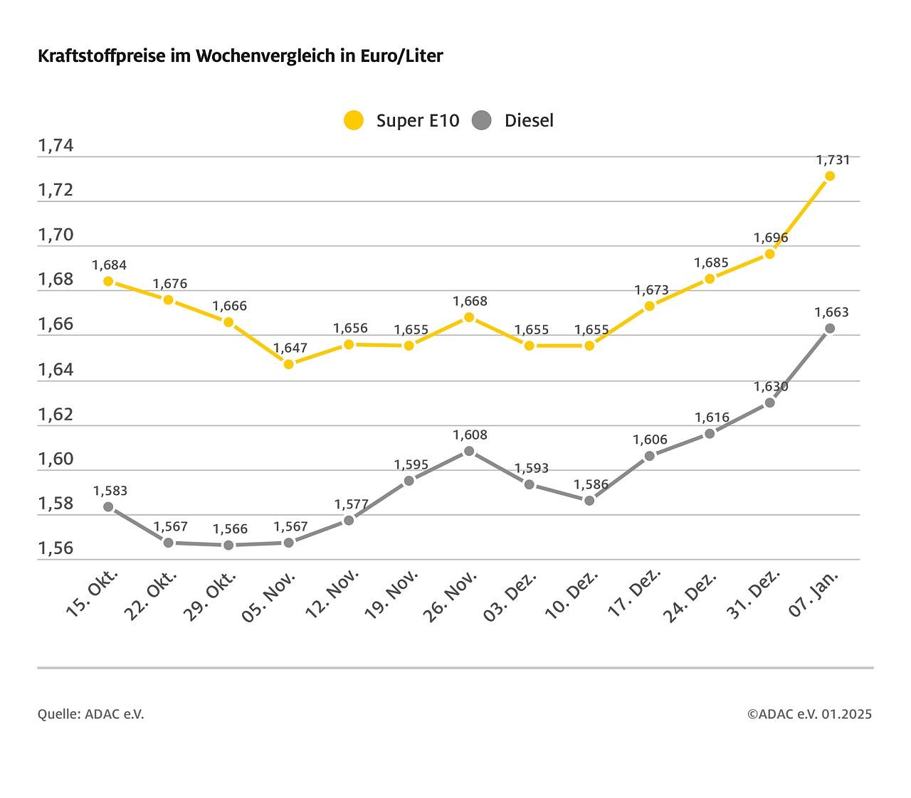 Wie die aktuelle ADAC Auswertung der Kraftstoffpreise in Deutschland ergibt, kostet ein Liter Super E10 im Mittel 1,731 Euro und damit 3,5 Cent mehr als in der Vorwoche. Für einen Liter Diesel müssen die Autofahrerinnen und Autofahrer derzeit im Schnitt 1,663 Euro bezahlen – ein Plus von 3,3 Cent.