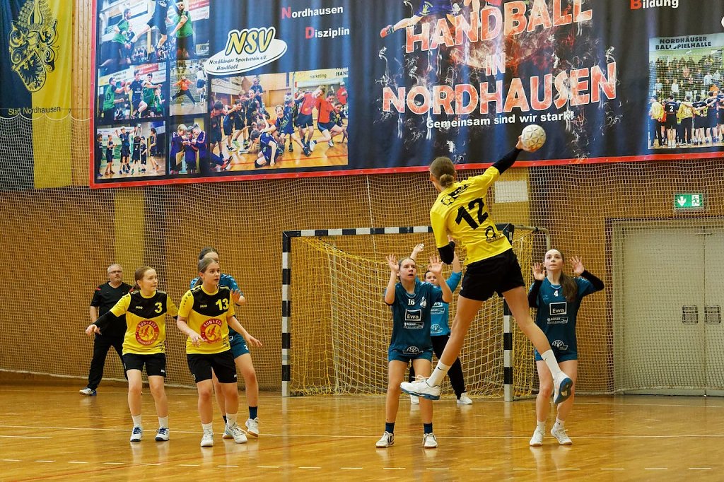 Beide Teams boten alles auf was sie derzeit aufbieten konnten, die Auswechselbänke platzten aus allen Nähten. Auch eine gut gefüllte Halle sorgte für die nötige Stimmung vor und während der Partie. Nordhausen mit anfänglichen abtasten schaltete zwei Gänge hoch und übernahm die Initiative. Halbzeitstand 15:7. Auch nach der Pause war vom Tabellenzweiten nicht viel zu sehen. Zu zögerlich ihre Angriffe, die zumeist in der NSV-Abwehr hängen blieben. Am Ende stand ein deutliches 34:18 Endergebnis an der Anzeigetafel. Die Rolandstädter sind damit das einzige noch verlustpunktfreie Team dieser Staffel.