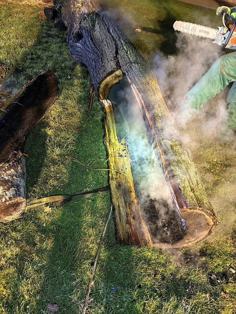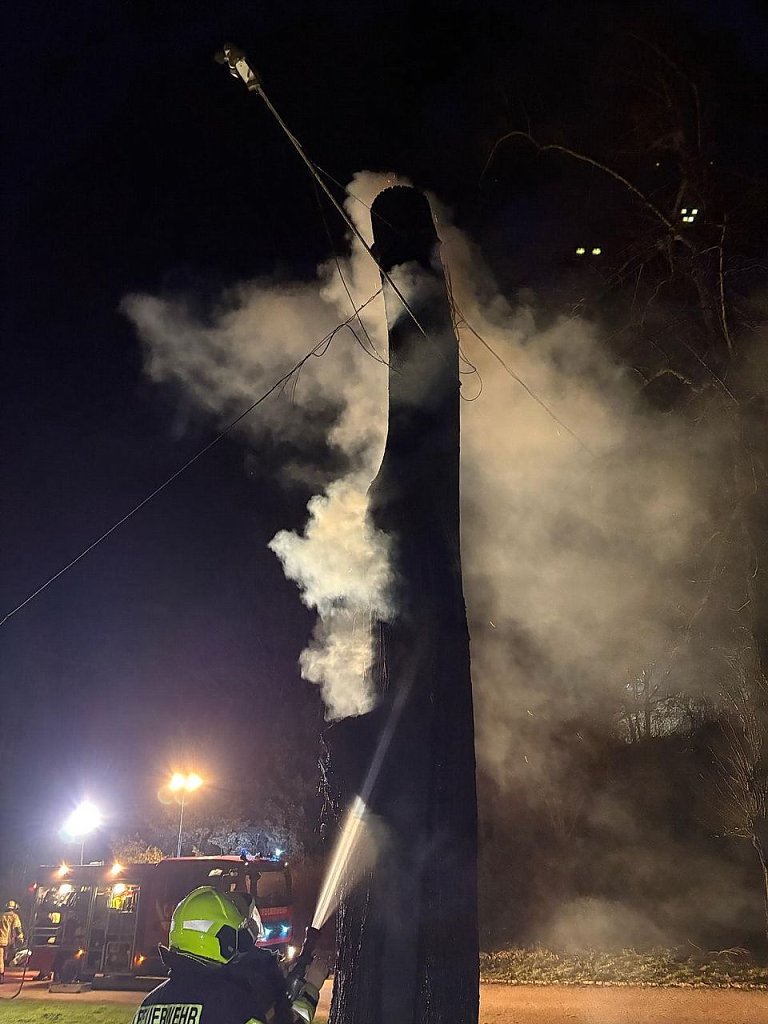 Der Baum wurde so stark beschädigt, dass er gefällt werden musste. Auch in diesem Fall geht die Polizei von Brandstiftung aus. Es ist bereits der dritte Brand innerhalb der letzten Tage, bei dem immer wieder Bäume angezündet wurden.