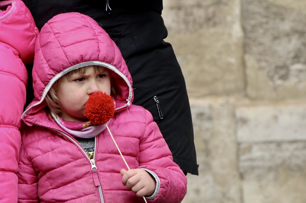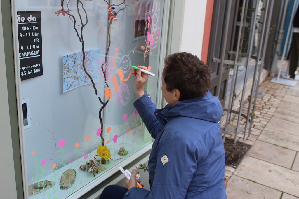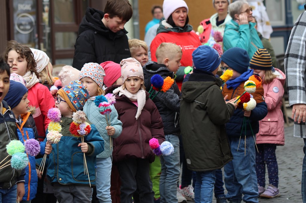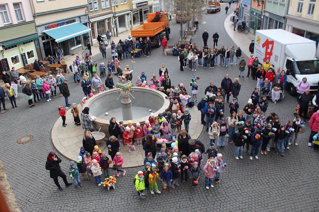 140 Bommelblumen aus dem Büro CM wurden an die Salza Knirpse verteilt. Damit wurden vor dem Umzug die Ostersträucher vor dem Rathaus geschmückt.