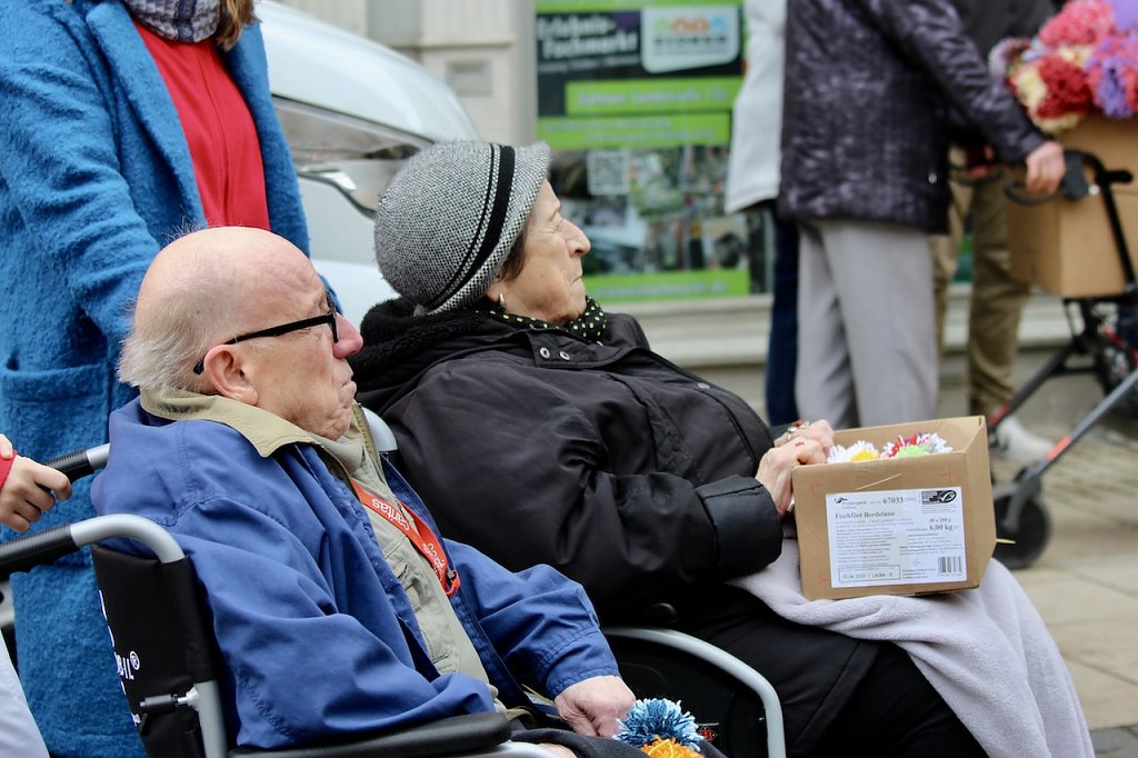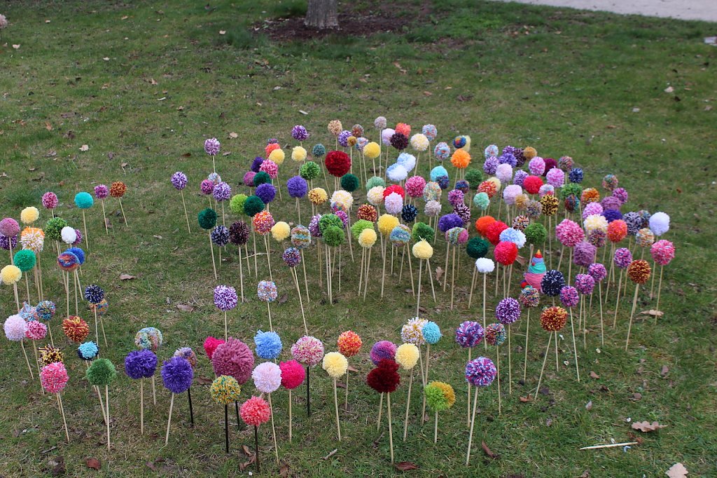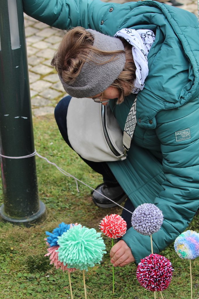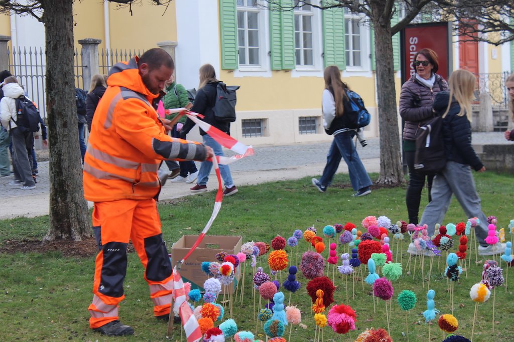Diese brachten heute knapp 2000 Bommelblumen mit vor das Rathaus, um sie nicht wie im vergangenen Jahr in und um die Bäume der Stadt zu drapieren, sondern damit an zwei unterschiedlichen Orten die Wiese zu schmücken.