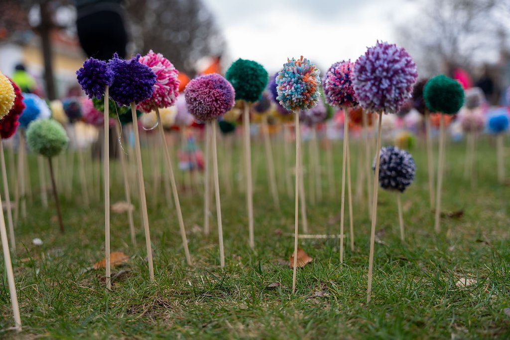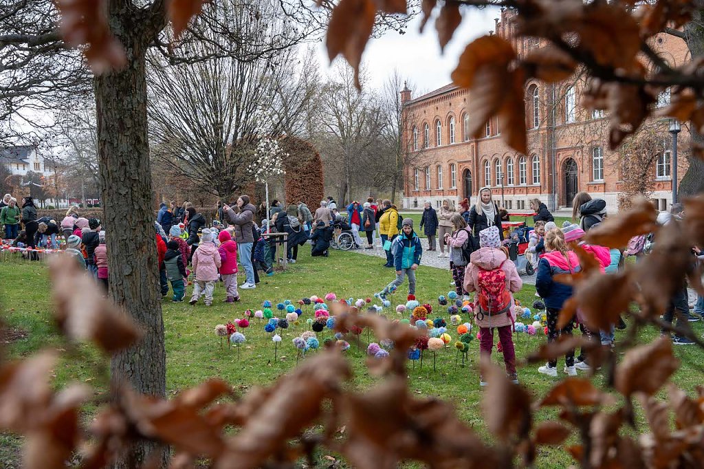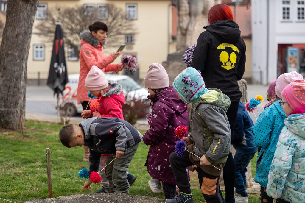 Fleißige Händen sorgten für bunte Frühlingsbommeln, die der noch nicht so bunten Natur zur Farbenpracht verhalfen. Oder wie Großmeister Goethe bei der heutigen Aktion zur Natur gesagt hätte: Doch an Blumen fehlt’s im Revier, sie nimmt wollene Bommeln dafür.
