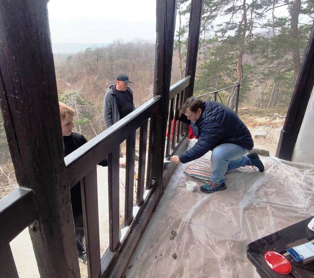 Es wird das 140 Jahre alte Holz lasiert, die Wände gestrichen, Löcher ausgespachtelt, die Schutzhütte ausgekehrt und die zuführenden Wege von Stolperfallen befreit. Dabei sind die Teilnehmer von 8 bis über 60 Jahre schon so routiniert, dass jeder seine Aufgaben kennt und die Arbeit schnell von der Hand geht.