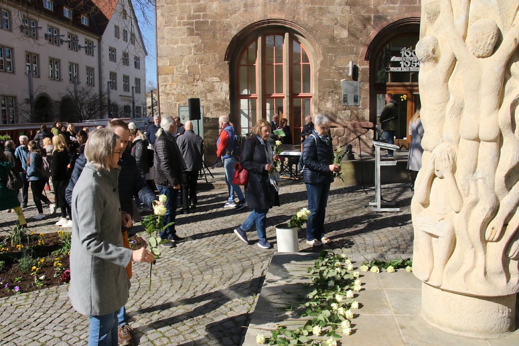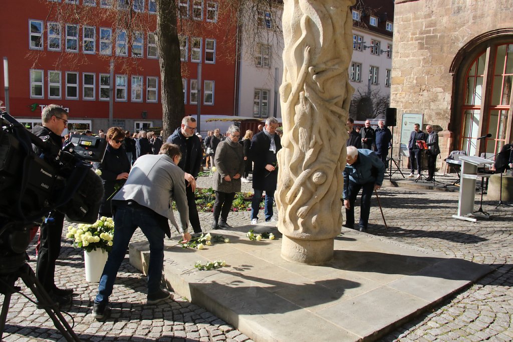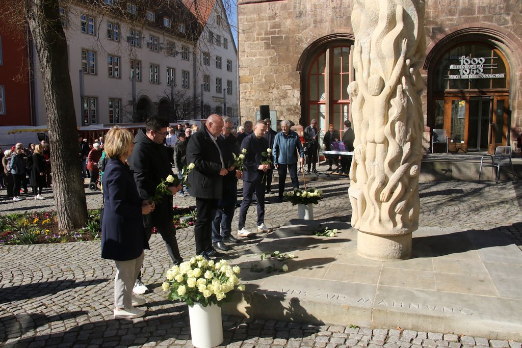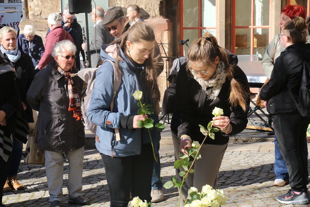 Das unbeschreibliche in Worte zu fassen ist eigentlich eine Aufgabe für den Dichter. Vor der Stele am Rathaus fand man heute auch mit Poesie Wege, die Schicksalstage Nordhausens vor 80 Jahren eindringlich in die Gegenwart zu holen…